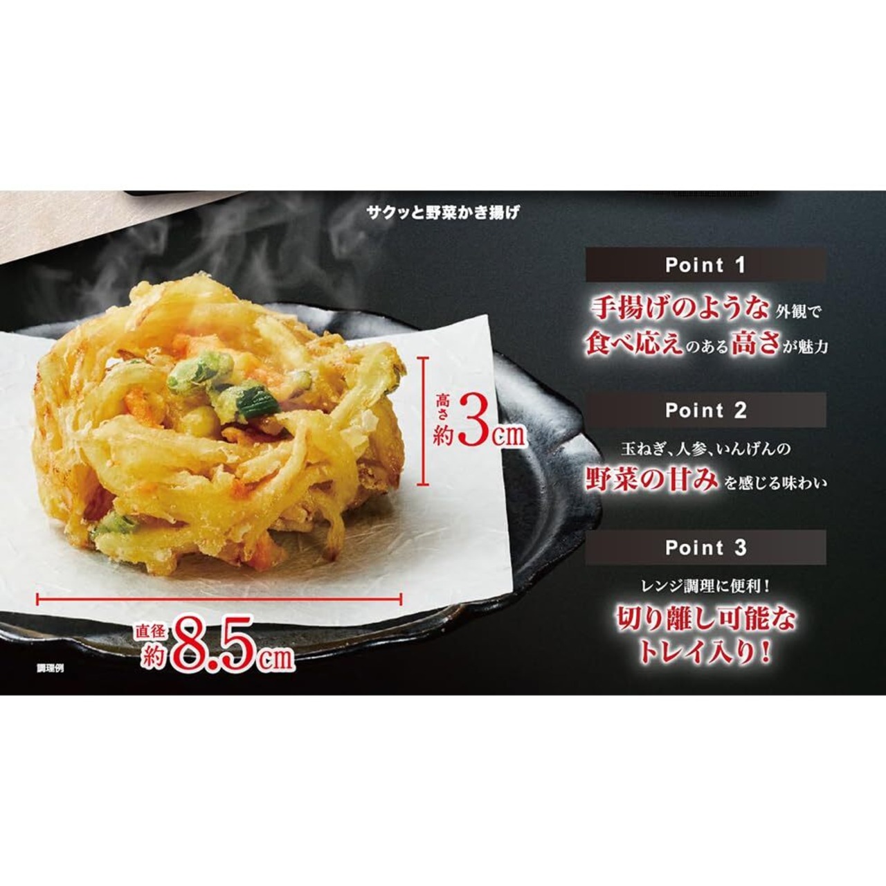 冷凍野菜かき揚げおいしさのポイント食べ応えのある厚みが魅力の冷凍野菜かき揚げ。3種類の野菜を使用し、野菜の甘みを感じる味わい。おいしさのポイント②油で揚げてあります おかずや丼のトッピングにも うれしい厚み3cmご注意加熱後は大変熱くなりますのでご注意ください。