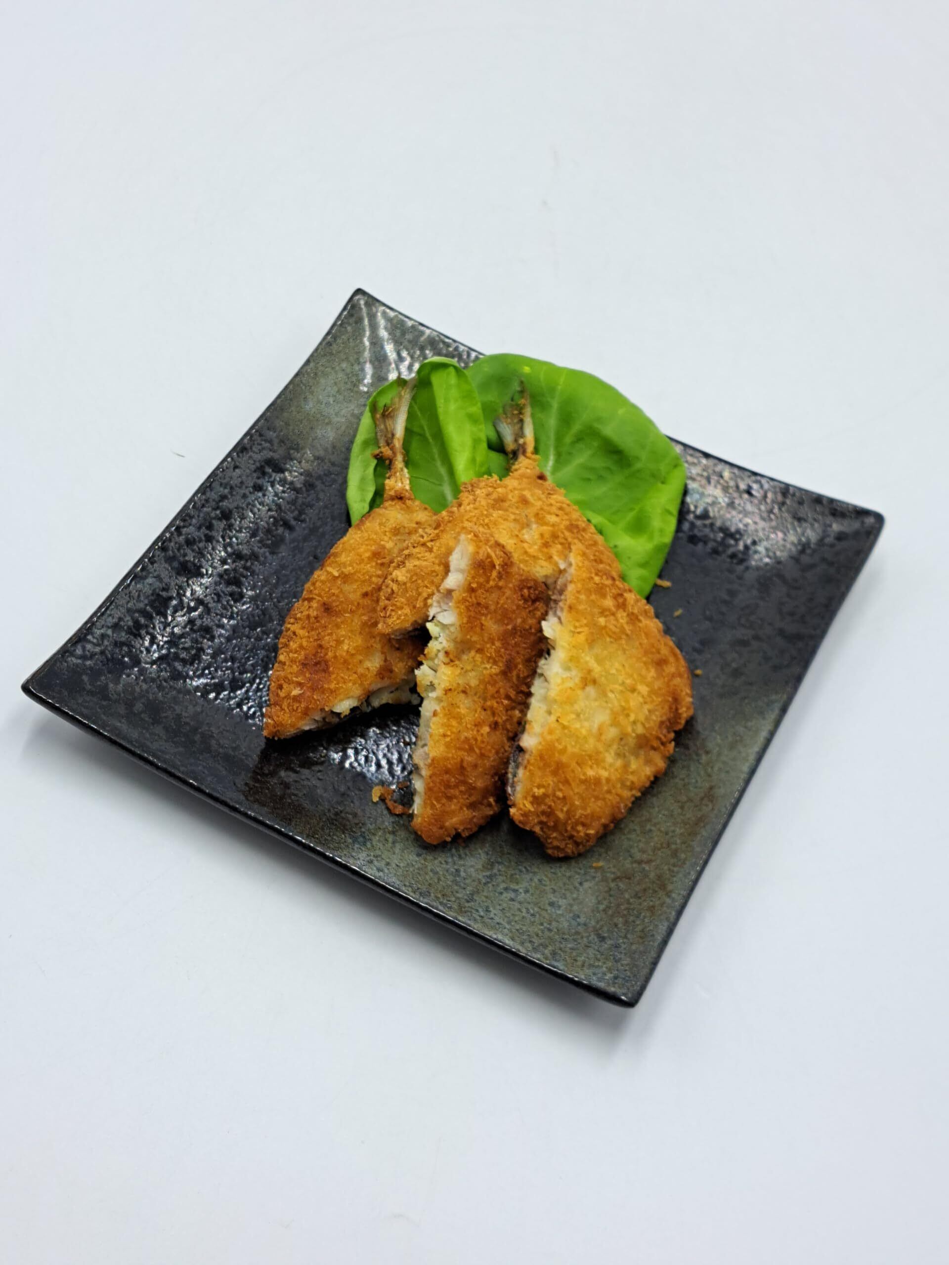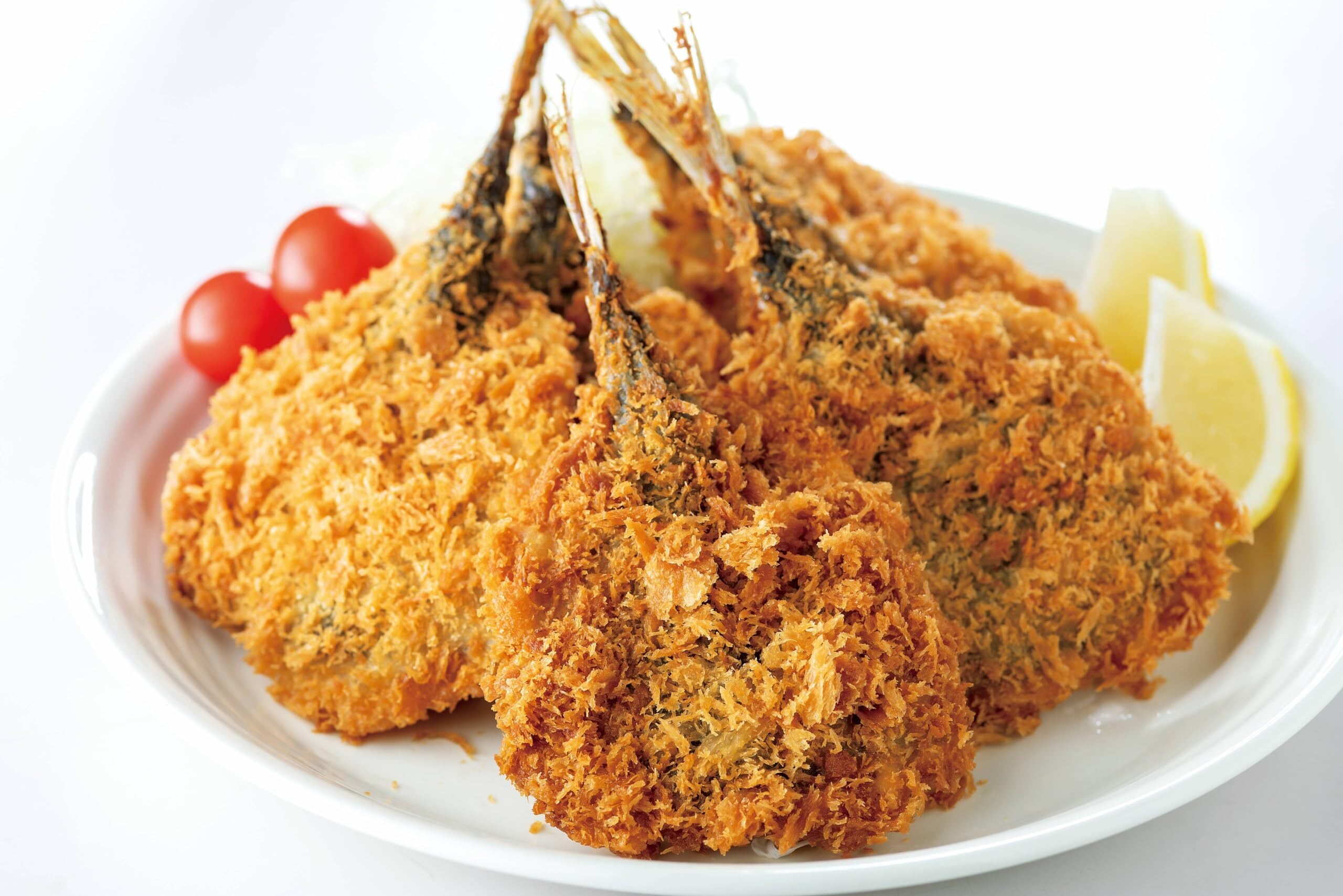 境港産の新鮮な真アジを境港で加工、剣立ちが良くサクサク感が強い荒目の生パン粉を使用、衣率50%以下でアジ肉厚。味付けは塩と胡椒のみの逸品です。