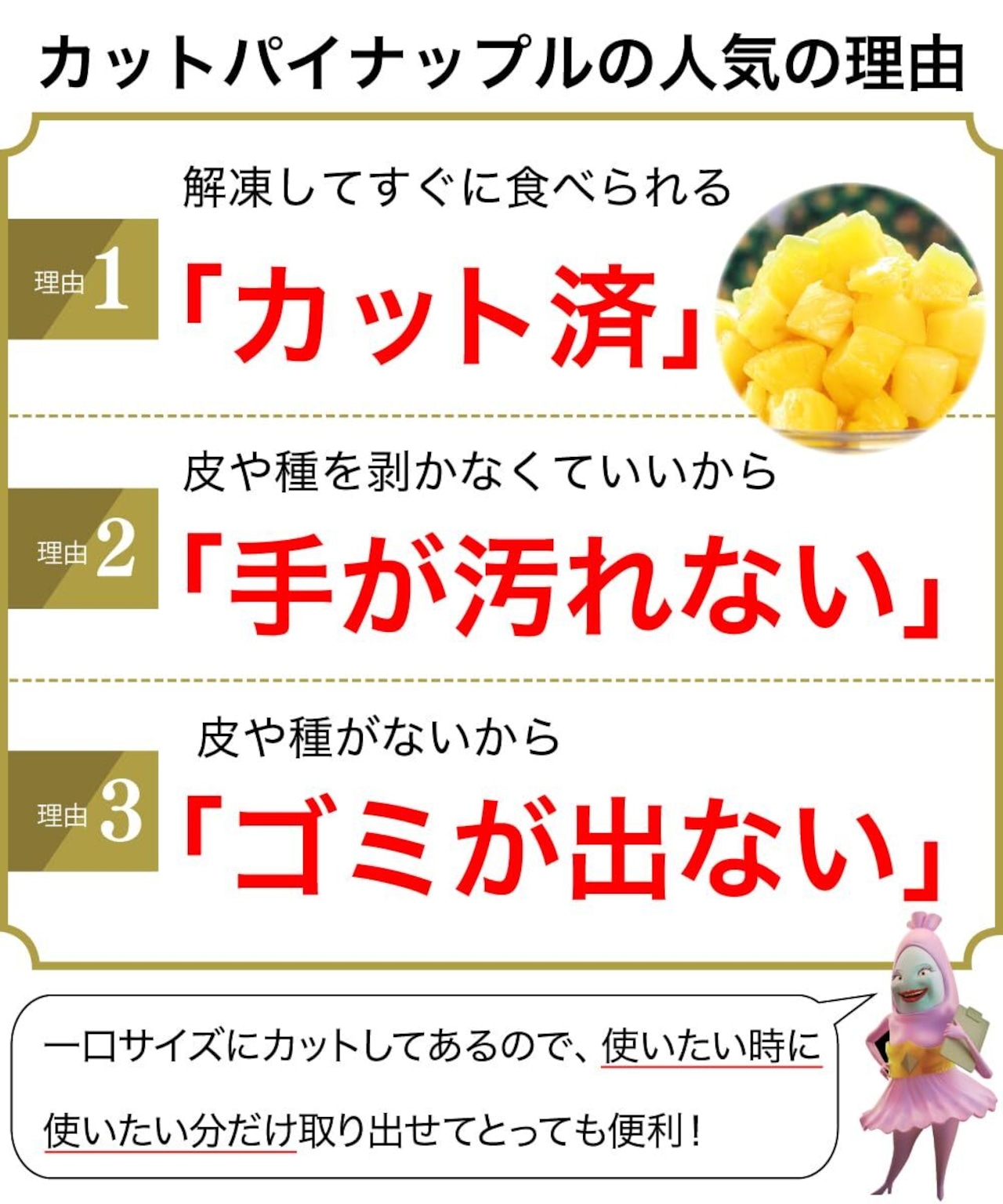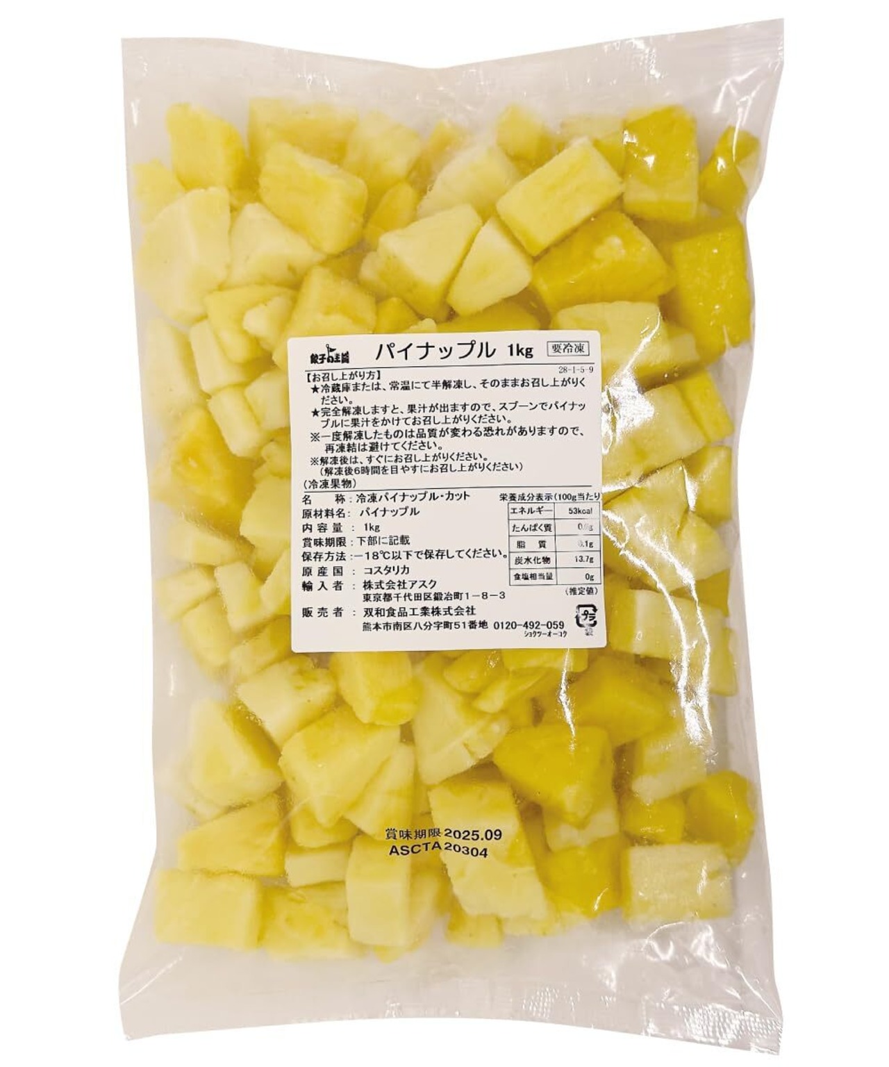 【原材料】パイナップル (コスタリカ又はペルー産) [砂糖不使用] 【内容量】1kg (カット済み。果肉のみ)
