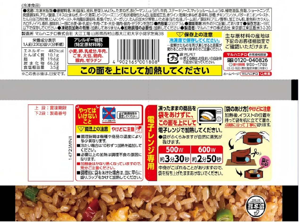 米(国産)、液卵、野菜(いんげん、たまねぎ、赤ピーマン、しょうが)、牛肉、ステーキソース、マッシュルーム、しょうゆ、植物油脂、食塩、ショートニング、発酵調味料、アミノ酸液、エキス(たまねぎ、ポーク、野菜)、ビーフシーズニング、粒状植物性たん白、油脂加工品、赤ワイン、乾燥たまねぎ、香辛料、砂糖、チキンコンソメ、バターオニオンペースト、たん白自己消化物、にんにくペースト、牛肉風味調味料、乾燥パセリ、マーガリン、たん白加水分解物、いため油(なたね油、パーム油)/調味料(アミノ酸等)、加工でん粉、着色料(カラメル、カロチノイド)、香料、酸味料、(一部に小麦・卵・乳成分・牛肉・ごま・大豆・鶏肉・豚肉・ゼラチンを含む)