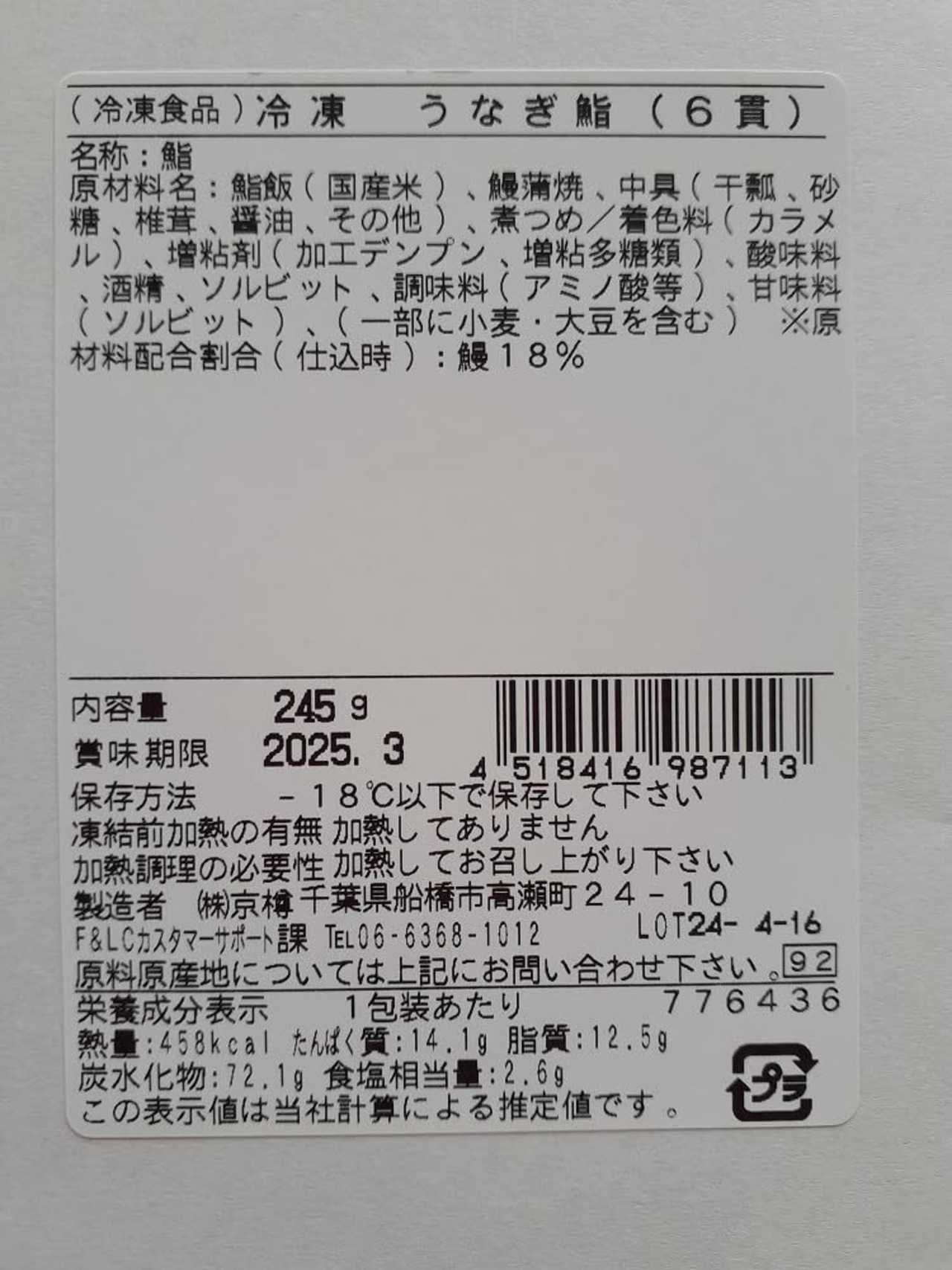 鮨飯(国産米)、鰻蒲焼、中具(干瓢、砂糖、椎茸、醤油、その他)、煮つめ/着色料(カラメル)、増粘剤(加工デンプン、増粘多糖類)、酸味料、酒精、ソルビット、調味料(アミノ酸等)、甘味料(ソルビット)、(一部に小麦・大豆を含む) ※原材料配合割合(仕込時):鰻18%