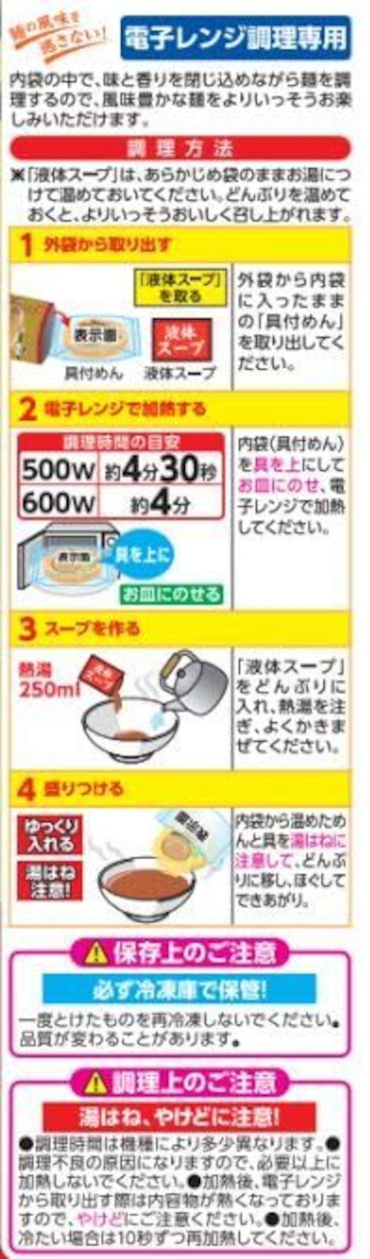 めん〔小麦粉(国内製造)、小麦全粒粉、食塩、卵粉、小麦たん白/かんすい、焼成Ca、クチナシ色素〕、スープ〔しょうゆ、チキンエキス、鶏脂、魚介エキス、チキン調味油、豚脂、食塩、香味調味料、たん白加水分解物、砂糖、野菜エキス、にぼし調味油、粉末しょうゆ、しいたけエキス、ガーリックペースト、きのこ調味料、香辛料/調味料(アミノ酸等)、香料、pH調整剤、酸味料、カラメル色素、酸化防止剤(ローズマリー抽出物、ビタミンE)〕、具〔焼豚、ねぎ、味付メンマ/アラビアガム、調味料(アミノ酸等)、カラメル色素、酸化防止剤(ビタミンE)、香辛料抽出物〕、(一部に小麦・卵・乳成分・牛肉・ごま・さば・大豆・鶏肉・豚肉・りんご・ゼラチンを含む)