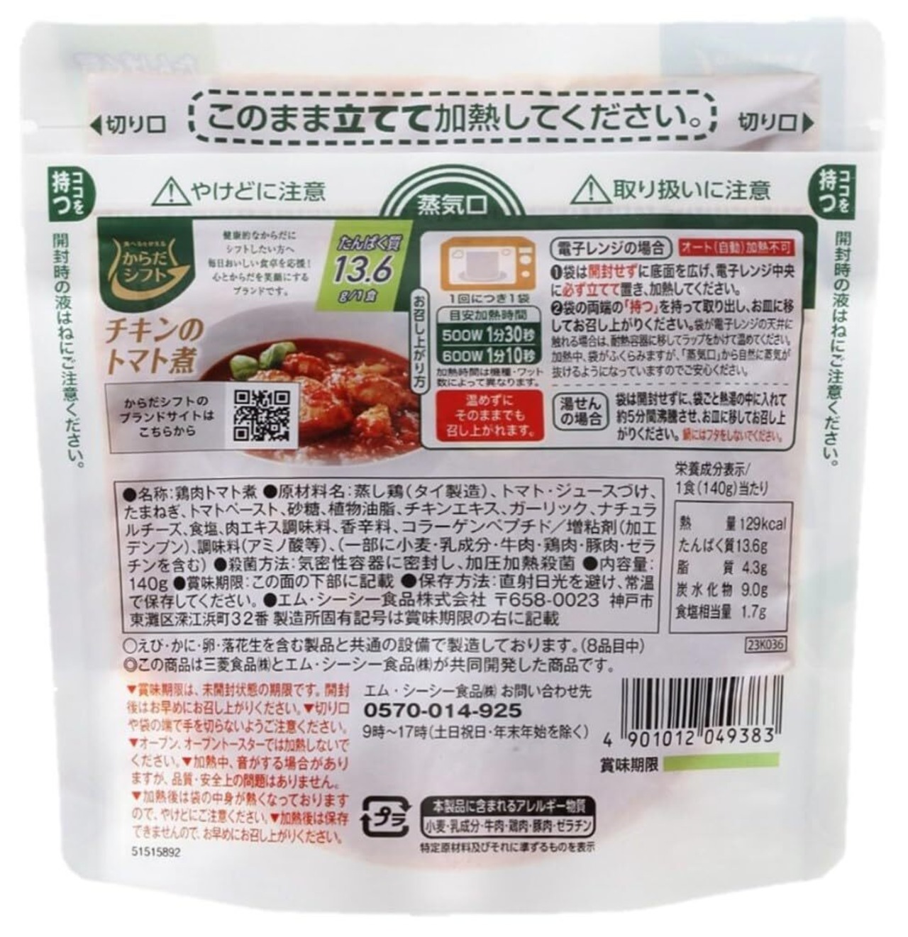 【栄養成分】1食(140g)当たり:熱量129kcal、たんぱく質13.6g、脂質4.3g、炭水化物9.0g、食塩相当量1.7g