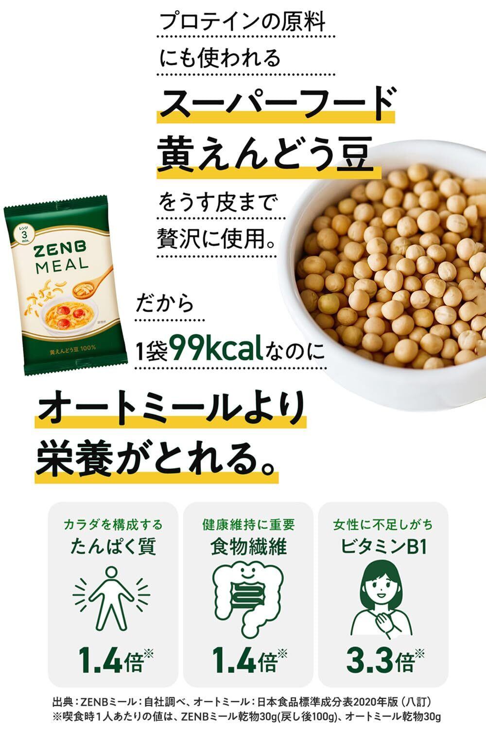 累計販売食数2000万食*1を突破した「 ZENBヌードル ( ゼンブヌードル )」と同じ、スーパーフード黄えんどう豆を使った、豆100%オートミール*2「ゼンブミール」。ゼンブミールは話題のオートミールよりも、たんぱく質1.4倍*3、食物繊維1.4倍*3、ビタミンB1 3.4倍*3、脂質61%OFF*3。いろいろな栄養がとれるのに、1食99kal。オートミールのようにお米代わりやスープに入れて食べるだけなので簡単。(*1:2025年4月30日時点。*2:オーツ麦は使っていません。*3参照:日本食品標準成分表2020年版(八訂)喫食時1人前当たりの値は、ZENBミール乾物30g(戻し後100g)、オートミール乾物30g)