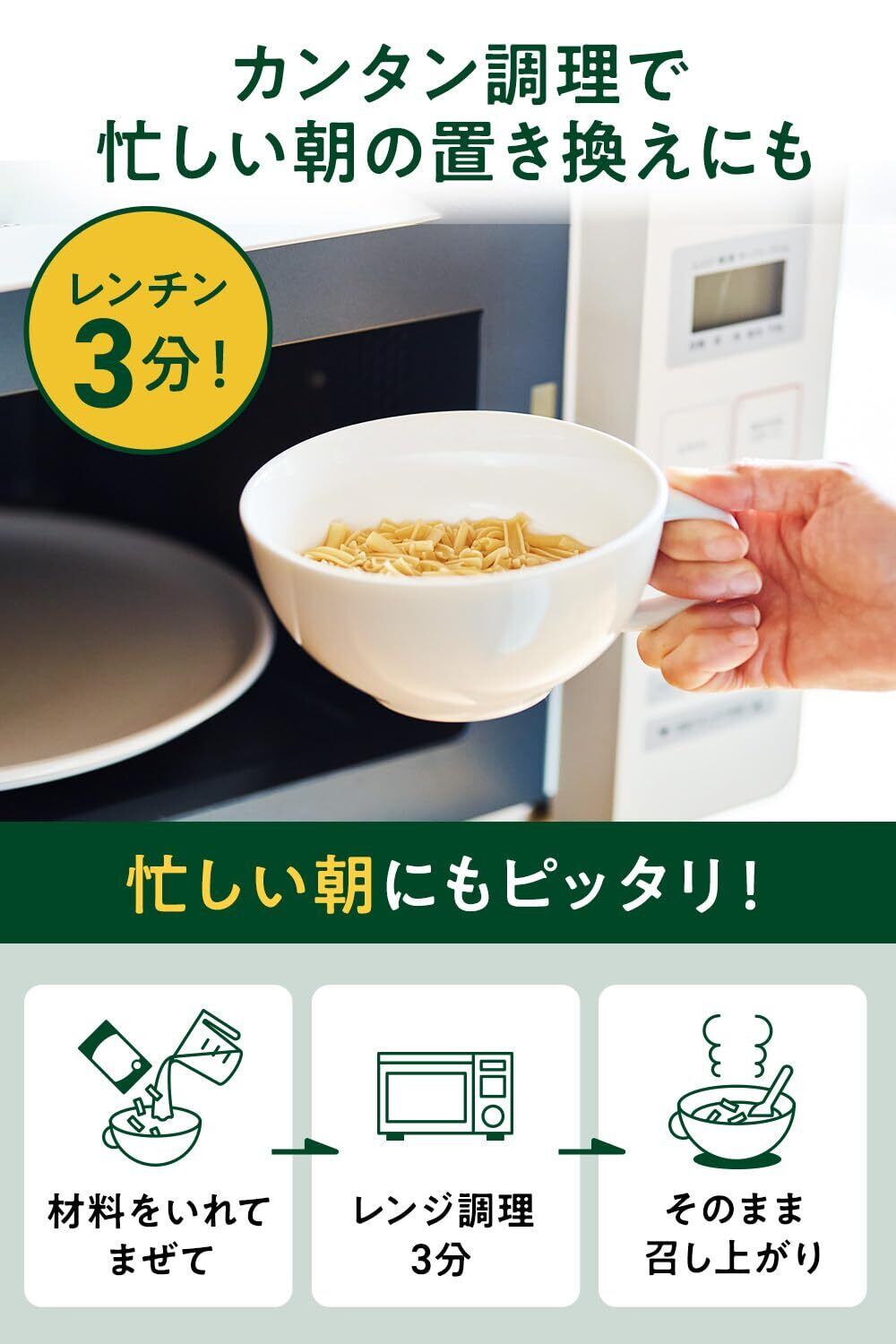 レンジで3分で完成:水150mlでさらもち食感に仕上がりスープメニューに。水80mlではとろもち食感でご飯や、リゾットメニューに最適。どちらもレンジで3分で食感の違いを楽しめます。マンネリしがちな毎朝のごはんに、ちょっとした楽しみとおいしさをお届けします。