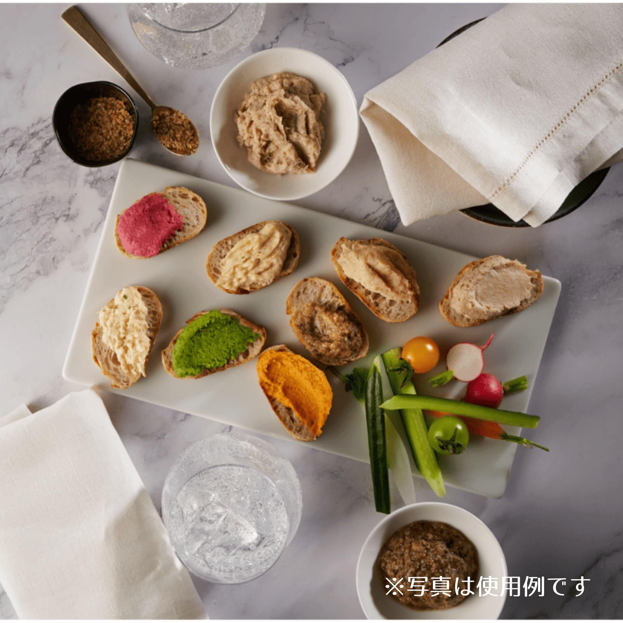 ア·ターブル!自家製フムス3種のセットです。フムスとは中東の定番料理で、白ごまやニンニク、レモン汁などを混ぜたひよこ豆のペーストのこと。低カロリーで高たんぱく、良質な脂質のほか、ビタミン、マグネシウムや鉄分などのミネラルや食物繊維が豊富な最強のヘルシー食です。3種のフムスはどれも動物性食品不使用で、ベジタリアン、ヴィーガン対応。さまざまなスパイスやハーブを駆使して、食欲をそそる香りと、プラントベースながら深いコクと豊かな風味を追求しました。 食べやすくカットしたスティック野菜にそのままディップしたり、クラッカーやバゲットに載せたりする以外にも、サラダ、肉料理の付け合わせ、サンドイッチ、パスタやリゾット、ピッツァの具材など、さまざまな使い方ができるのがフムスの魅力。同じ中東料理のクスクスの付け合わせにはもちろん、卵料理やアボカドとの相性も抜群です。 野菜本来の天然色素をそのまま生かしたカラフルな色味は、パーティーやおもてなしなど、テーブルを華やかに演出したい時にも活躍してくれます。 お好みで、デュカやパプリカパウダー、松の実やゴマ、刻みパセリやパクチー、オリーブオイルなどをかけてお召し上がりください。