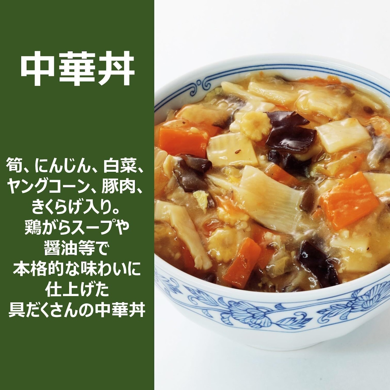 筍、にんじん、白菜、ヤングコーン、豚肉、きくらげ入り。鶏がらスープや醤油等で本格的な味わいに仕上げた具だくさんの中華丼。
