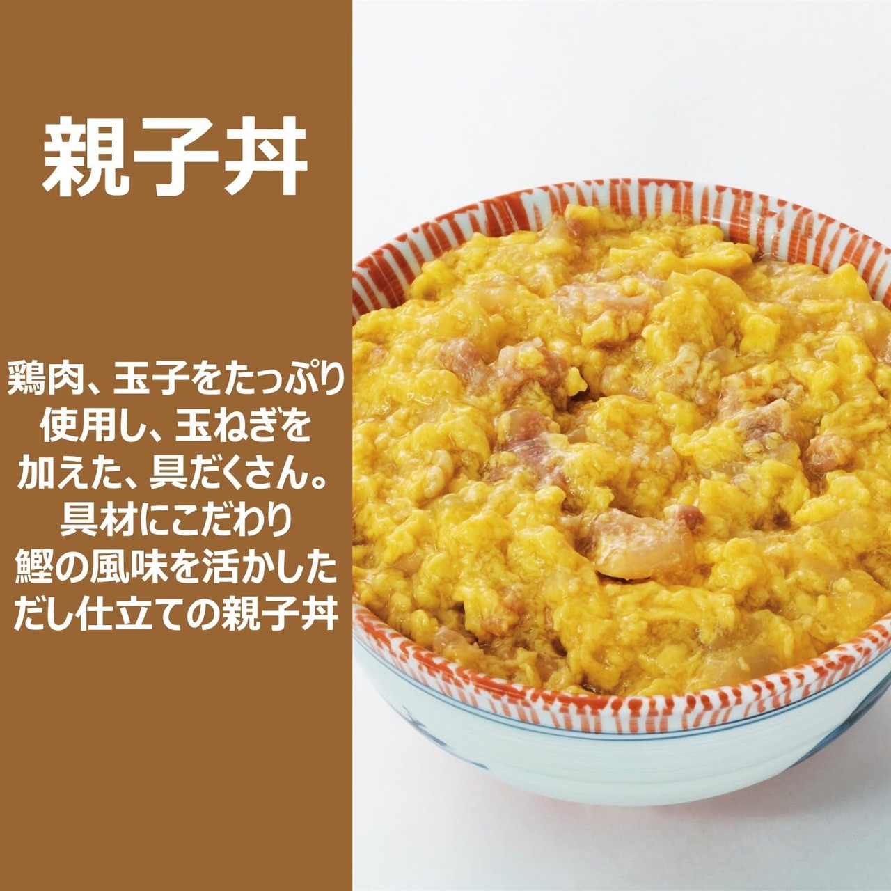 原材料:[親子丼] 鶏肉(国産)、鶏卵、玉ねぎ、発酵調味料、エキス(チキン、鰹節、酵母、鰹)、砂糖、食塩、醤油、たん白加水分解物、鶏脂/増粘剤(加工でん粉、キサンタン)、調味料(アミノ酸等)、トレハロース、乳酸カルシウム、カロチノイド色素、(一部に卵・小麦・大豆・鶏肉を含む)|