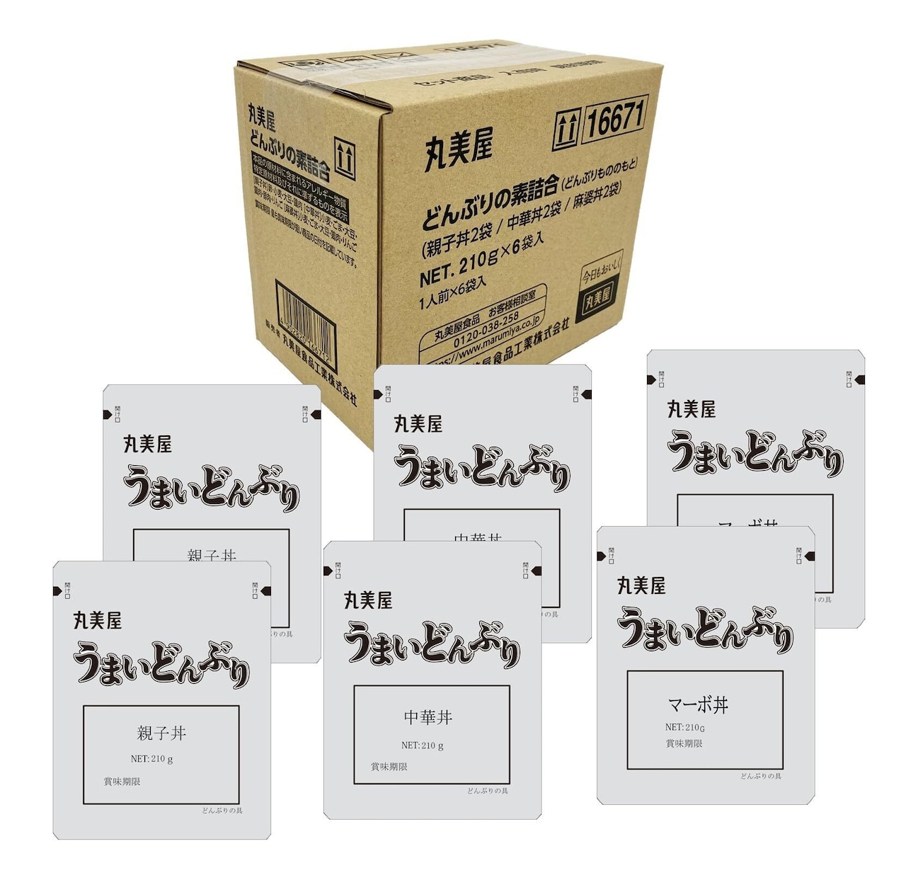 ・麻婆丼2個、中華丼2個、親子丼2個、計6個を詰め合わせた商品です。