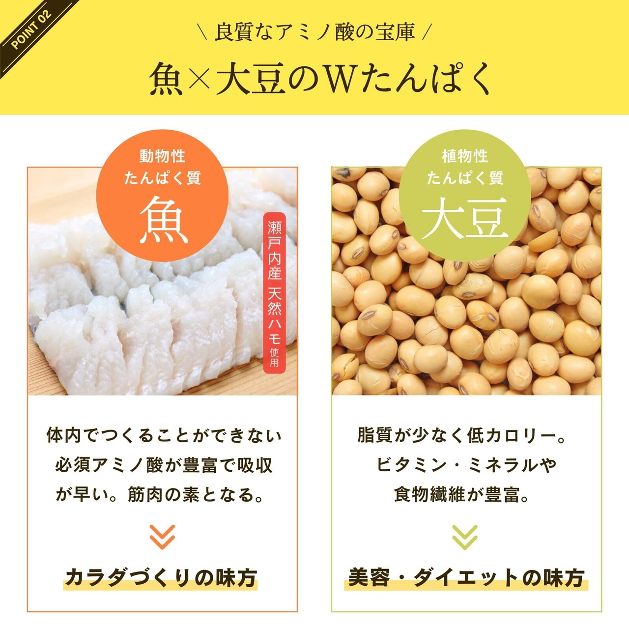 魚 × 大豆のWたんぱく。特徴の異なる2種類のたんぱく質を摂ることで、あなたのカラダづくり・健康づくりを効率的にサポートします。