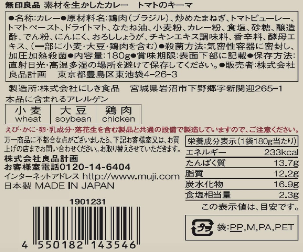 原材料名:鶏肉(ブラジル)、炒めたまねぎ、トマトピューレー、トマトペースト、ドライトマト、なたね油、小麦粉、カレー粉、食塩、砂糖、醸造酢、でん粉、にんにく、おろししょうが、チキンエキス調味料、香辛料、酵母エキス、(一部に小麦・大豆・鶏肉を含む)