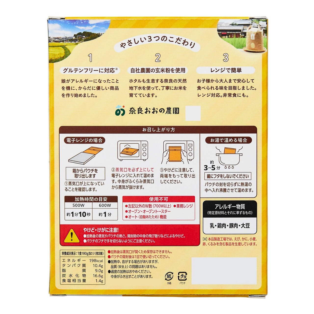 原材料名:トマトソース、牛乳、玉ねぎ、鶏肉、ケチャップ、玄米粉(奈良県産ヒノヒカリ金鵄米)、バター、三温糖、カレー粉、こめ油、にんにく、鶏ガラスープ、ナンプラー、食塩、ガラムマサラ、ブラックペッパー(一部に乳成分・鶏肉・豚肉・大豆を含む)