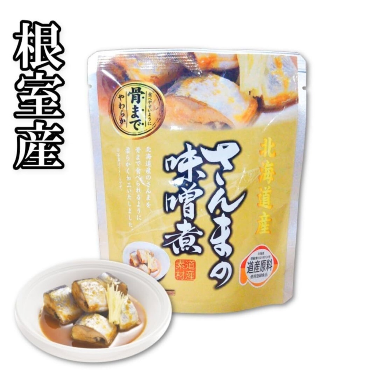 さんまの味噌煮:道東沖で漁獲された鮮度の良い秋刀魚を原料に使用し、味噌ベースの兼由独自の調味液で味付け。95g(固形量70g)