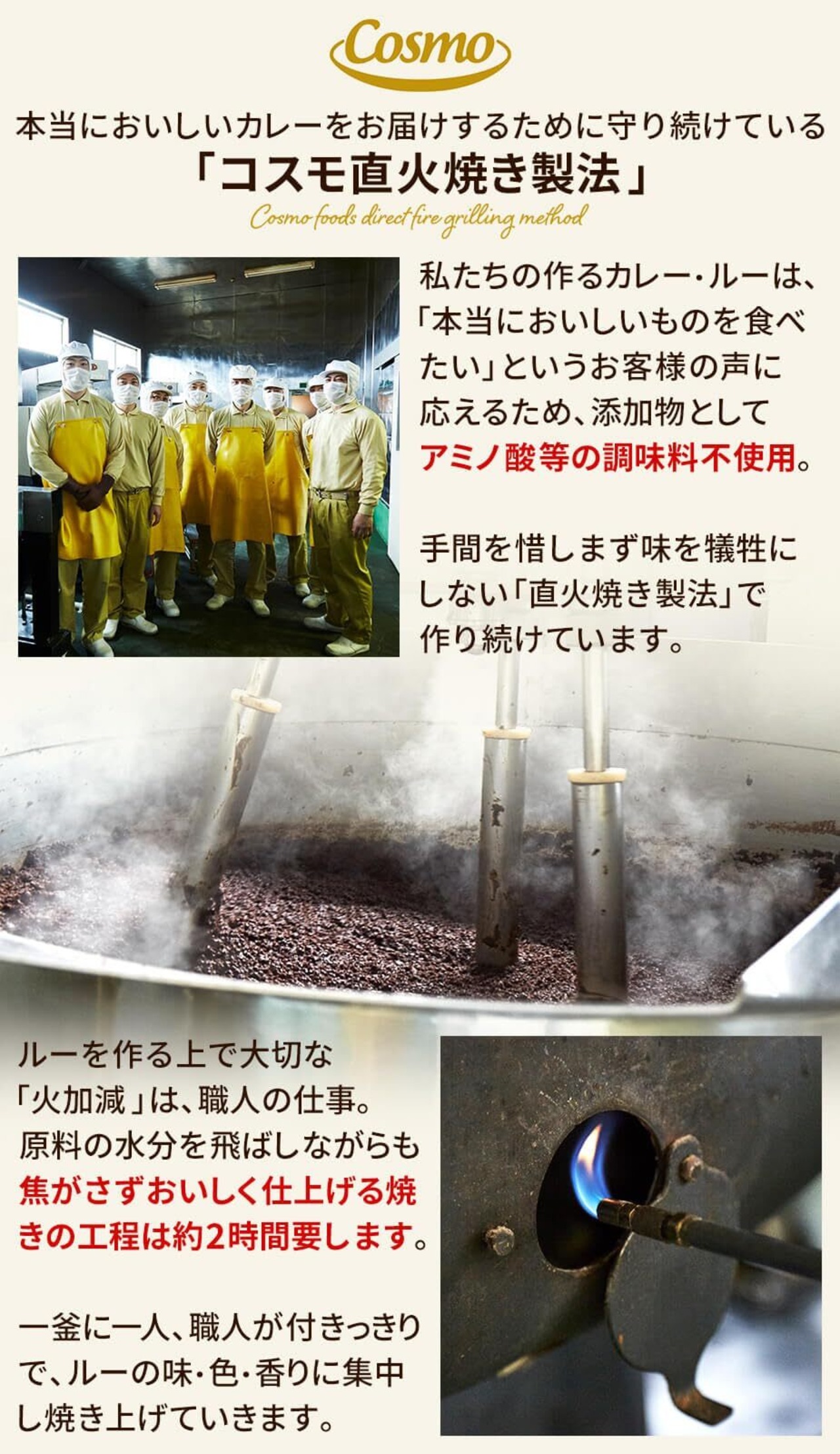 ギュッと溶け込む牛肉の旨味!隠し味のチャツネでバランスよく仕上げたビーフカレーです。本当に美味しいカレーをお届けする為に守り続けている「コスモ直火焼き製法」 手間を惜しまず味を犠牲にしない「直火焼き製法」で作り続けています。