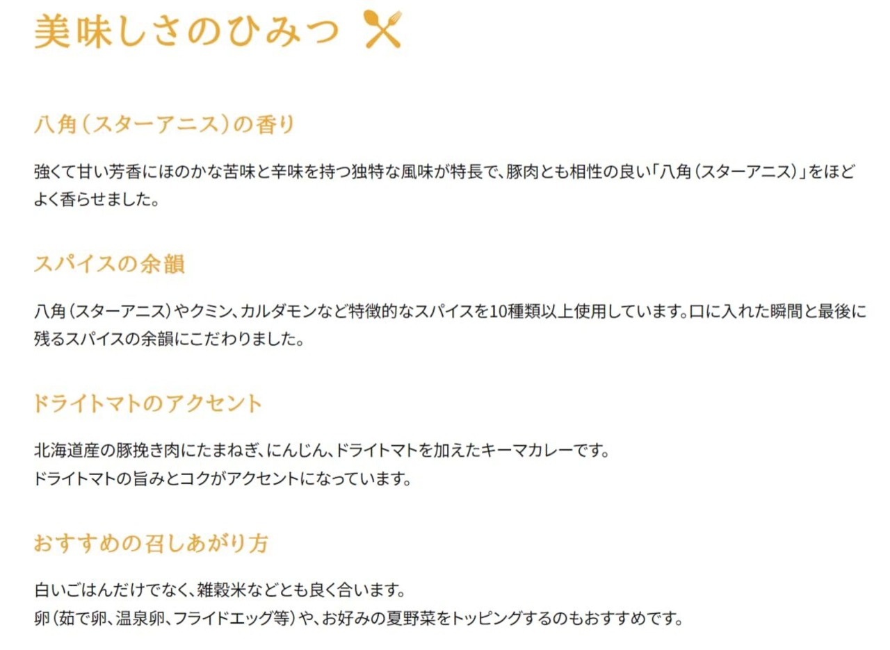 北海道産の豚挽き肉、香味野菜とドライトマトを加え、八角(スターアニス)をほどよく効かせた、夏にぴったりのスパイシーキーマカレーです。