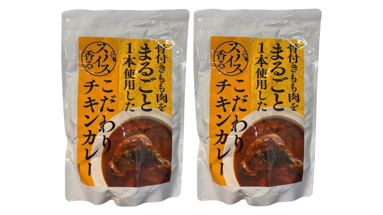 内容量:400g × 2袋(1袋あたり骨付きもも肉1本入り) 原材料:鶏肉(タイ産)、牛乳、りんごピューレ、カレールウ、トマトピューレ、チャツネなど