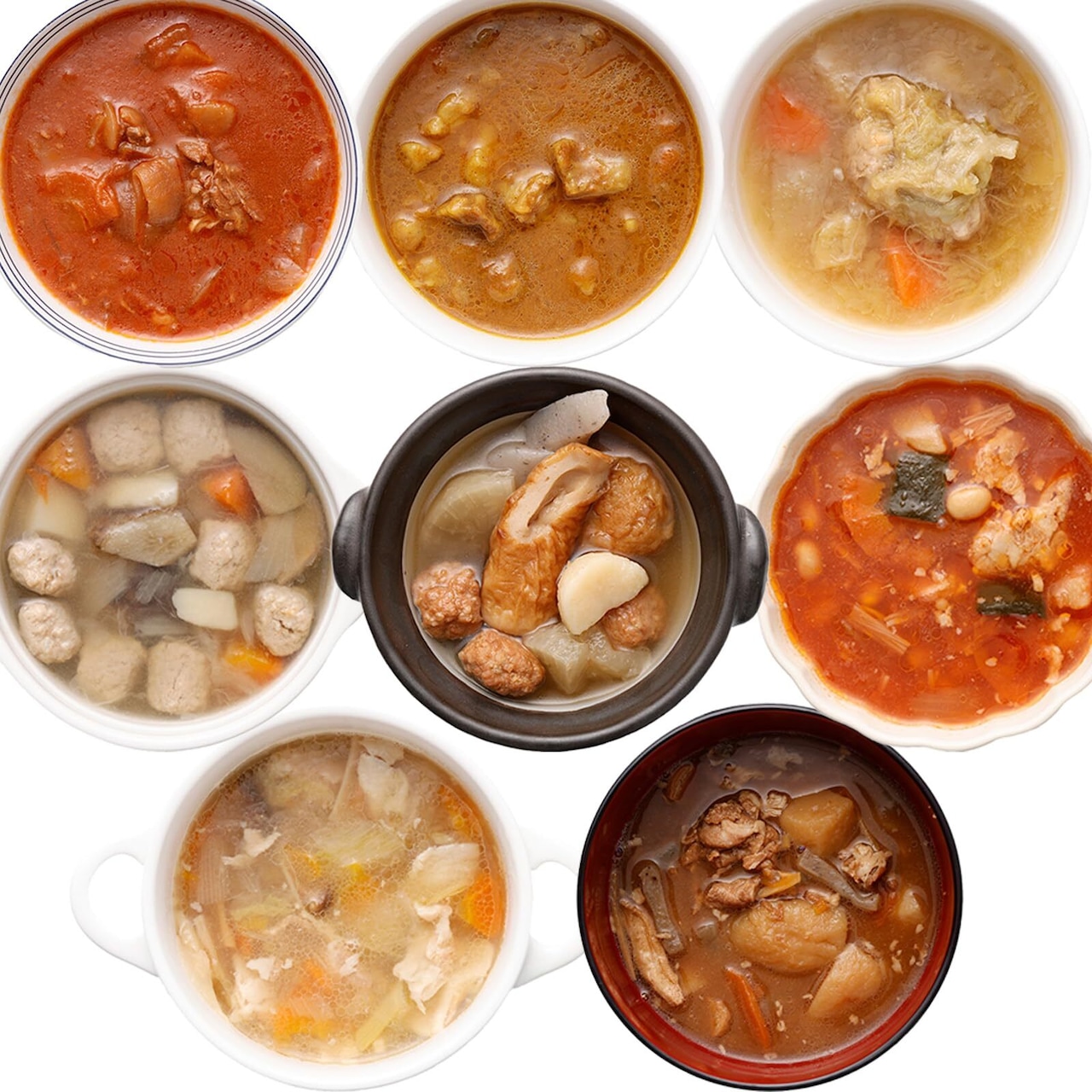 旨味も栄養もすべて飲み干す【スープオカズ】シリーズ全6種類と、ルウ不使用にこだわったカレーとハヤシをセットにしました。
