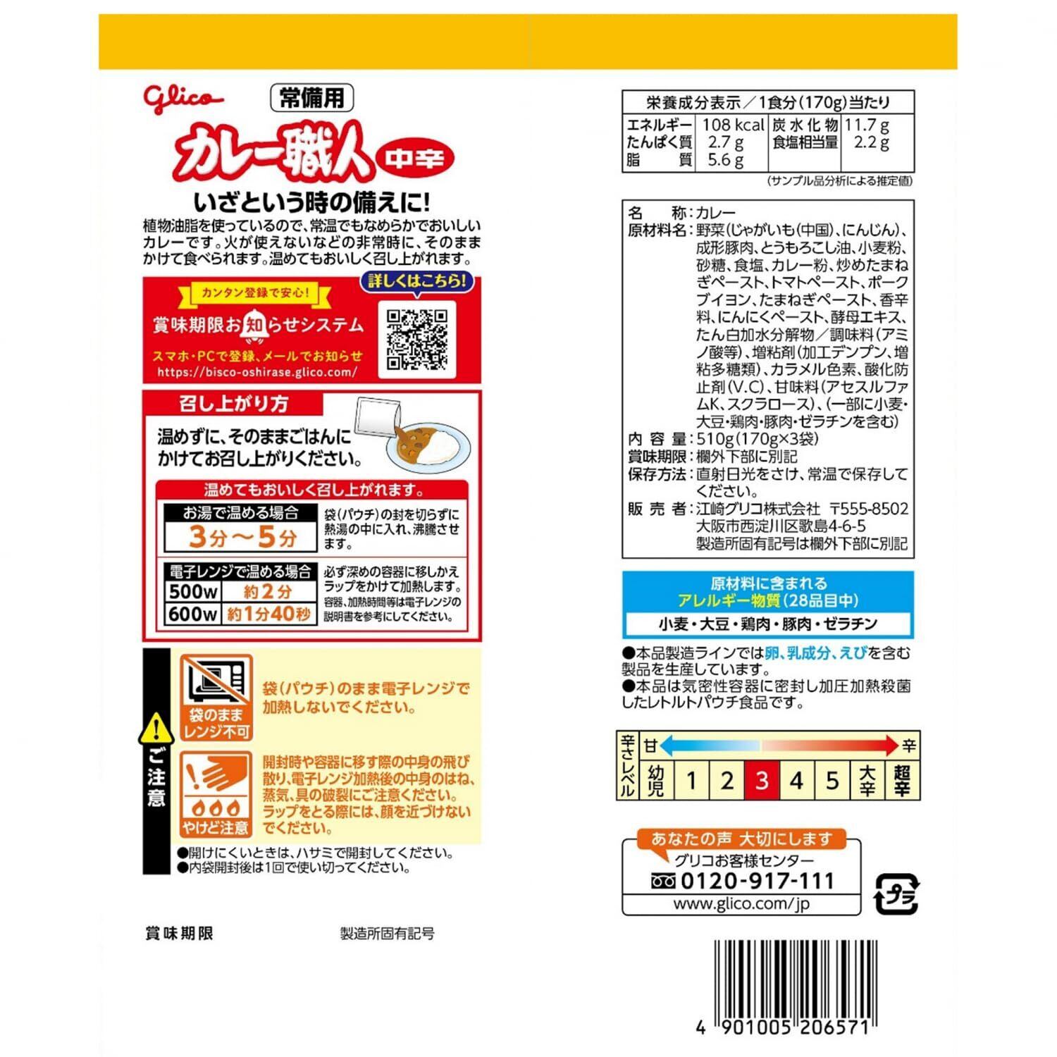 常備用 温めずに食べられるカレー職人 中辛 3食パック×5個 江崎グリコ (常温保存/非常食/備蓄/ローリングストック/レトルト/防災/レンジ対応)