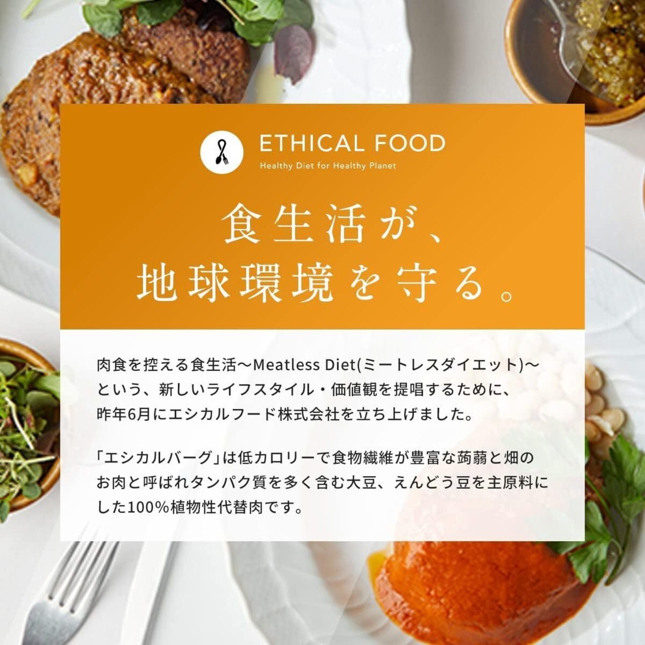 【ETHICAL FOOD エシカルフード】 「食生活が、地球環境を守る」をテーマに、肉食を控える食生活「ミートレスダイエット」という、新しいライフスタイルを提唱するため2021年6月に発足しました。日本でも、SDGsの認知が広まる中、環境や社会問題に多くの人々が関心を持ちながらも、個人として何ができるのか分からず、最初の一歩を踏み出せない人が多くいます。私たちが提唱する「ミートレスダイエット」は、個人で始められる、最も身近なSDGsアクションです。