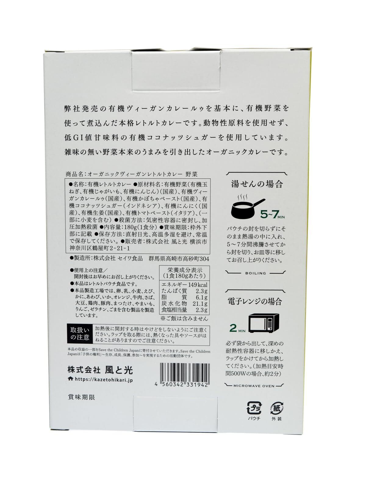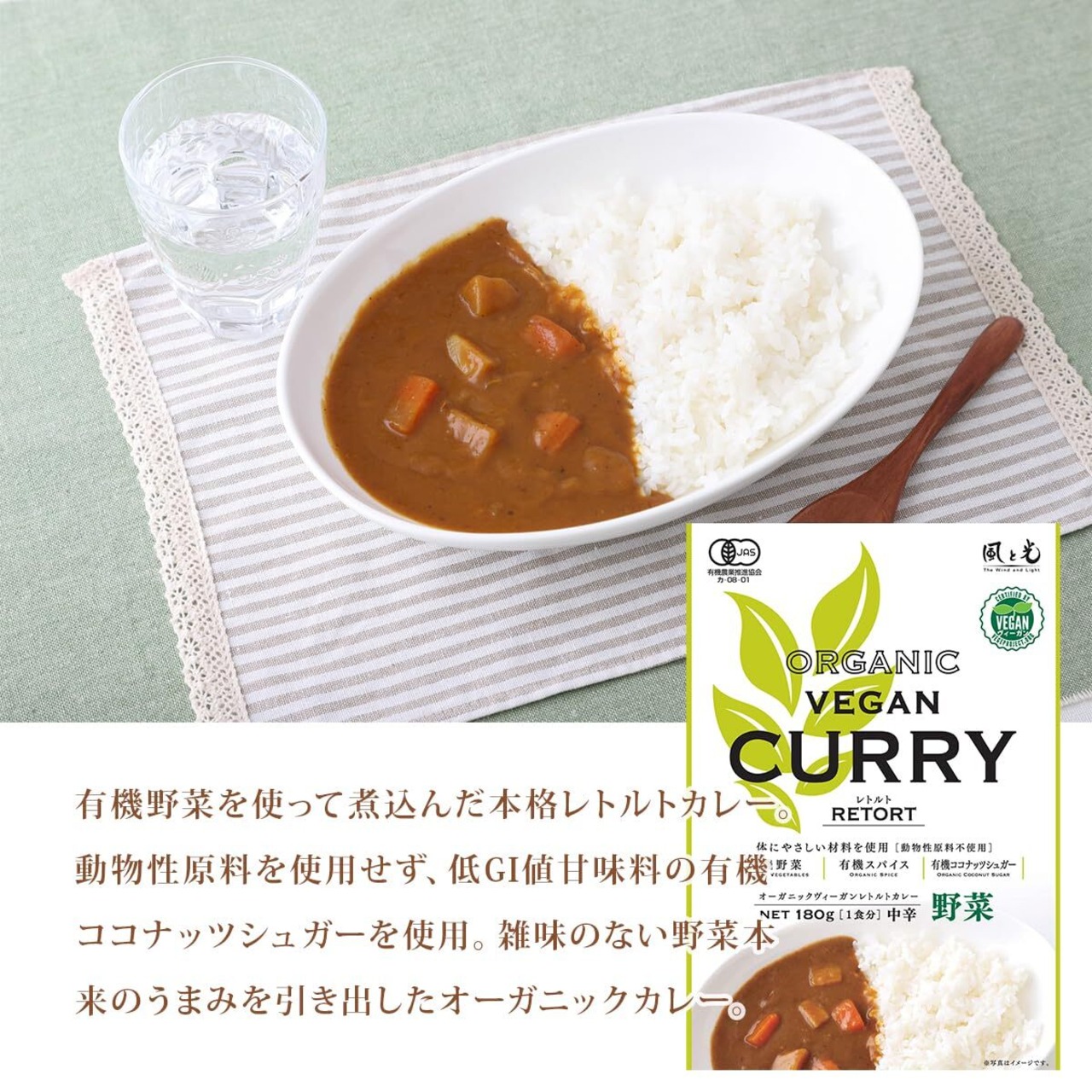 特徴(オーガニック ヴィーガンレトルトカレー 野菜):風と光の有機ヴィーガンカレールゥを基本に、有機野菜(玉ねぎ、じゃがいも、にんじん)をふんだんに使って煮込んだ本格レトルトカレー。動物性原料を使用せず、低GI値※甘味料の有機ココナッツシュガーを使用。雑味の無い野菜本来のうまみ。