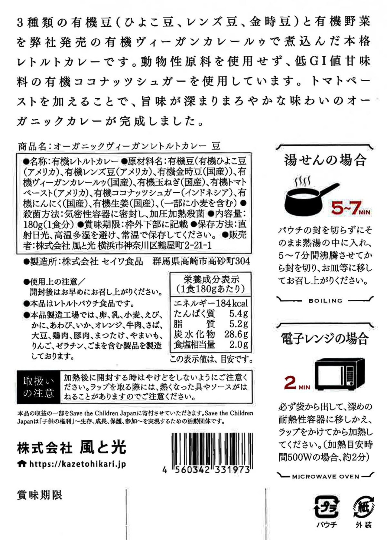 特徴(オーガニック ヴィーガンレトルトカレー 豆):3種類の有機豆(ひよこ豆、レンズ豆、金時豆)(国産)と有機野菜を発売の有機ヴィーガンカレールゥで煮込んだ本格レトルトカレー。動物性原料を使用せず、低GI値甘味料の有機ココナッツシュガーを使用。滋味深くまろやかな味わい。