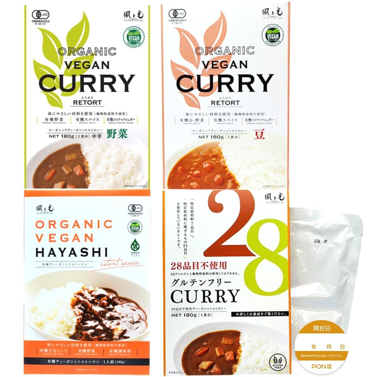 内容量:オーガニック ヴィーガンレトルトカレー 野菜 180g、オーガニック ヴィーガンレトルトカレー 豆 180g、28品目不使用ヴィーガンレトルトカレー 甘口 180g、有機ヴィーガンレトルトハヤシ 180g 各1 計4入