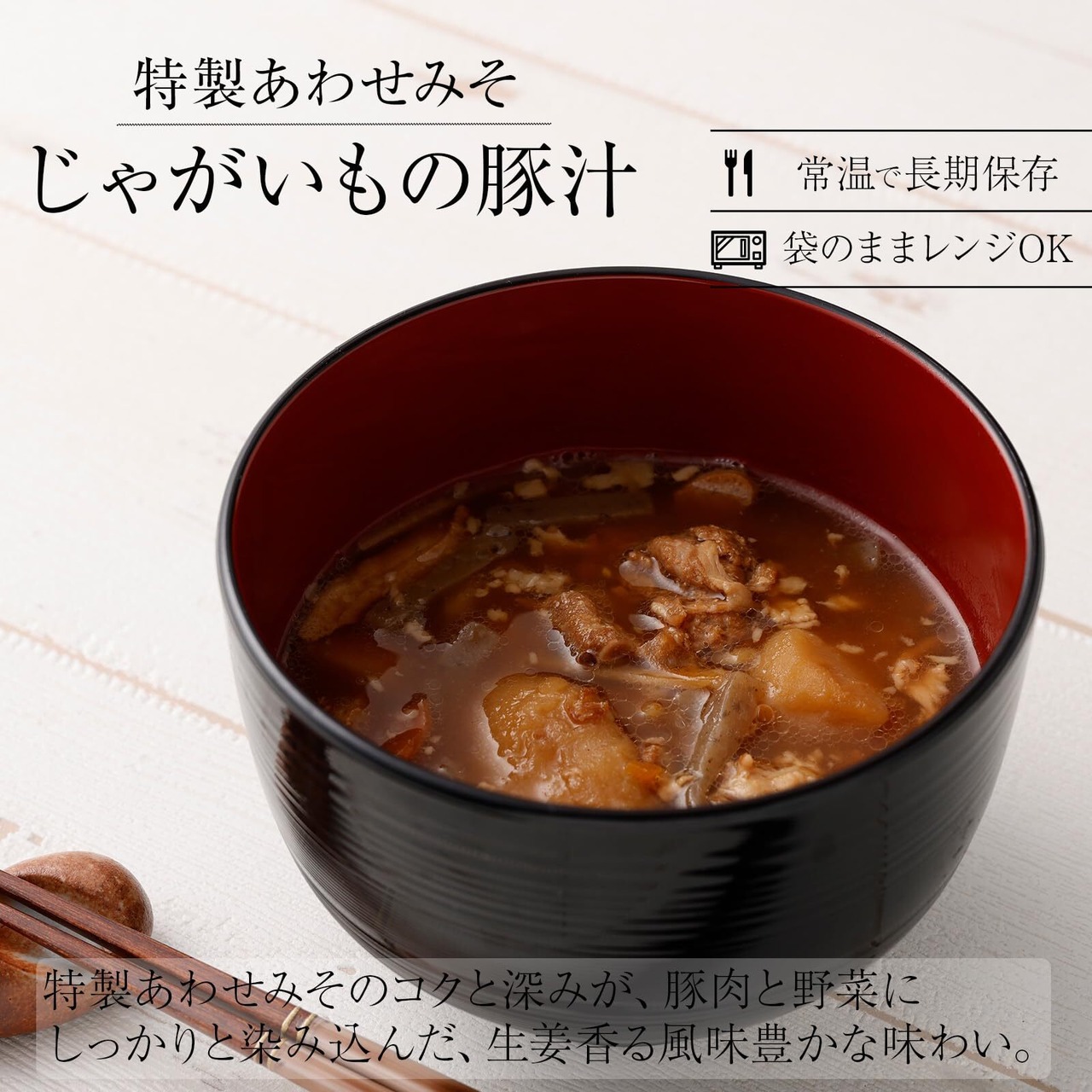 【原材料名】じゃがいも(国産)、豚肉、こんにゃく、人参、白味噌、醤油、油あげ、八丁味噌、生姜、砂糖、かつおだし、/こん にゃく用凝固剤(水酸化カルシウム)、豆腐用凝固剤、(一部に豚肉・小麦・大豆を含む)