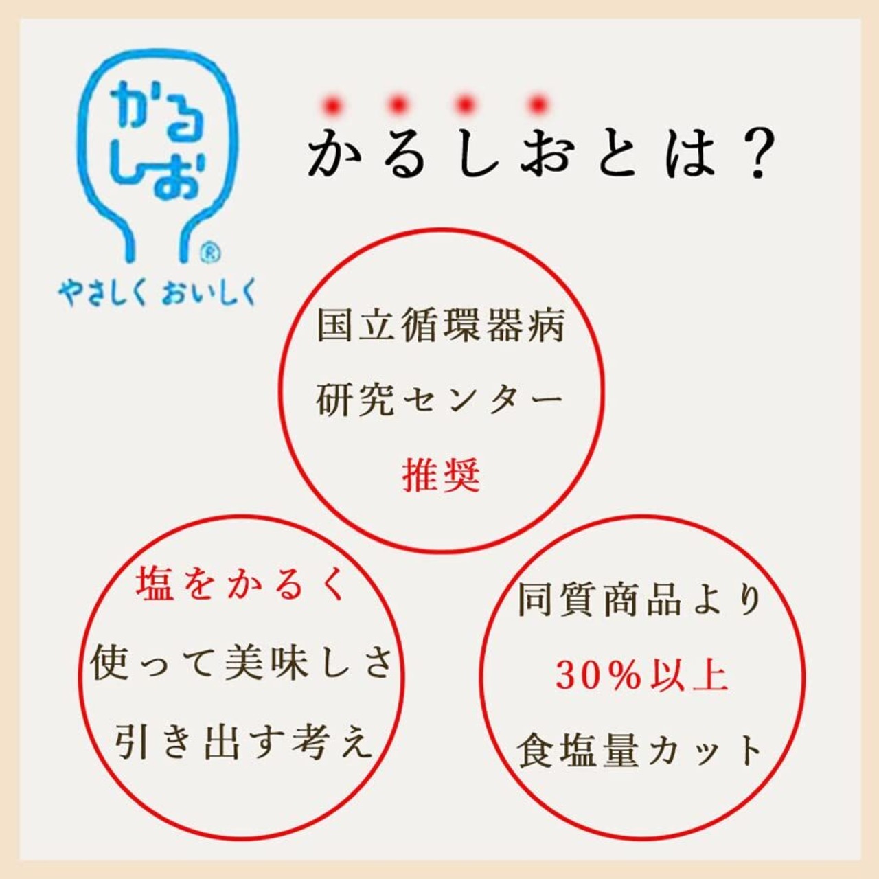 塩分を大幅にカットし、こだわり食材で満足感のある食事を!国立循環器病研究センターが推奨する、塩をかるく使って、 美味しさ引き出す考え方「かるしお」そのかるしお認定された商品も含まれています。かるしおとは、国立循環器病研究センター(国循)が推奨する「塩をかるく使って美味しさを引き出す」減塩の新しい考え方です。 国循では、研究成果やノウハウを社会へ還元するための取り組みとして、「知的資産の把握・発掘」を行っています。その成果の一つが「かるしお」です。