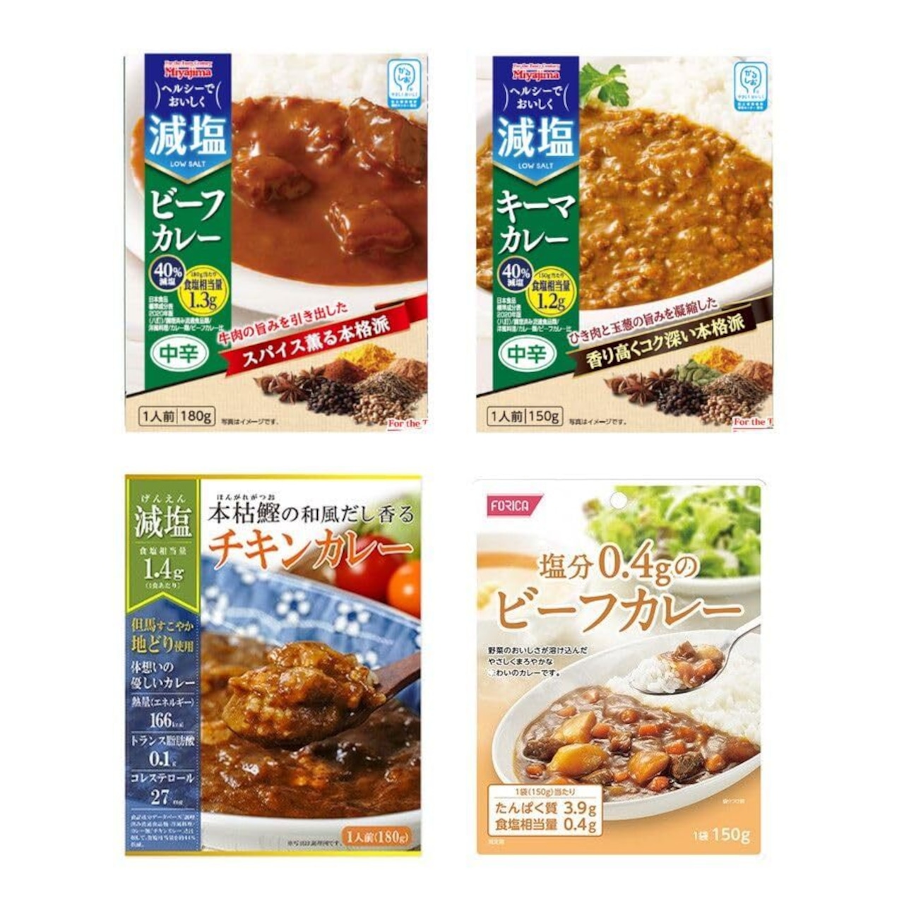 セット内容(各3個:●本枯鰹の和風だし香るチキンカレー●塩分0.4gのビーフカレー●減塩キーマカレー(かるしお)150g●減塩ビーフカレー(かるしお)180g