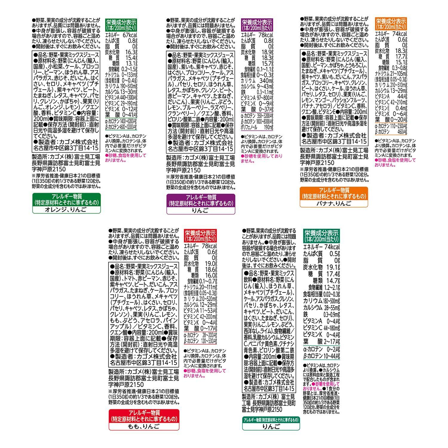 ●野菜生活100 オリジナル 200ml(野菜・果実ミックスジュース):野菜(にんじん(輸入、国産)、小松菜、ケール、ブロッコリー、ピーマン、ほうれん草、アスパラガス、赤じそ、だいこん、はくさい、セロリ、メキャベツ(プチヴェール)、紫キャベツ、ビート、たまねぎ、レタス、キャベツ、パセリ、クレソン、かぼちゃ)、果実(りんご、オレンジ、レモン)/クエン酸、香料、ビタミンC、●野菜生活100 ベリーサラダ 200ml(野菜・果実ミックスジュース):野菜(にんじん(輸入、国産)、紫いも、紫キャベツ、赤じそ、はくさい、ブロッコリー、ケール、アスパラガス、メキャベツ(プチヴェール)、パセリ、セロリ、ほうれん草、レタス、かぼちゃ、クレソン、ビート、赤ピーマン、キャベツ、たまねぎ、だいこん)、果実(りんご、ぶどう、レモン、ブルーベリー、ラズベリー、クランベリー)/クエン酸、香料、ピロリン酸第二鉄、●野菜生活100 マンゴーサラダ 200ml(野菜・果実ミックスジュース):野菜(にんじん(輸入、国産)、ピーマン、かぼちゃ、とうもろこし、たまねぎ、メキャベツ(プチヴェール)、紫キャベツ、紫いも、だいこん、アスパラガス、ブロッコリー、キャベツ、クレソン、ビート、はくさい、ケール、ほうれん草、パセリ、レタス、セロリ)、果実(りんご、レモン、マンゴー、パッションフルーツ、バナナ、アセロラ)/ビタミンC、香料、クエン酸、ビタミンB2、ビタミンE、ビタミンB12、●野菜生活100 アップルサラダ 200ml(野菜・果実ミックスジュース):野菜(にんじん(輸入、国産)、トマト、赤ピーマン、赤じそ、紫キャベツ、ビート、だいこん、アスパラガス、たまねぎ、ケール、ブロッコリー、ほうれん草、メキャベツ(プチヴェール)、はくさい、セロリ、パセリ、キャベツ、レタス、かぼちゃ、クレソン)、果実(りんご、レモン、もも、ぶどう、アセロラ、パインアップル)/乳酸カルシウム、ビタミンC、香料、クエン酸、●野菜生活100 グリーンサラダ 200ml(野菜・果実ミックスジュース):野菜(にんじん(輸入)、ほうれん草、メキャベツ(プチヴェール)、ケール、アスパラガス、クレソン、パセリ、かぼちゃ、レタス、キャベツ、ビート、だいこん、はくさい、たまねぎ、セロリ)、果実(りんご、レモン、ぶどう、西洋なし、ライム)、食物繊維/香料、乳酸カルシウム、ビタミンC、ベニバナ黄色素、クチナシ青色素、ピロリン酸第二鉄