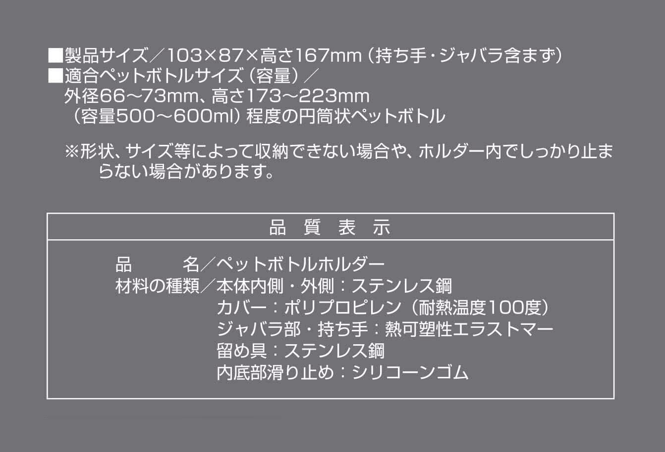 適合ペットボトルサイズ(容量):外径66~73mm、高さ173~223mm(容量500~600ml)程度の円筒状ペットボトル