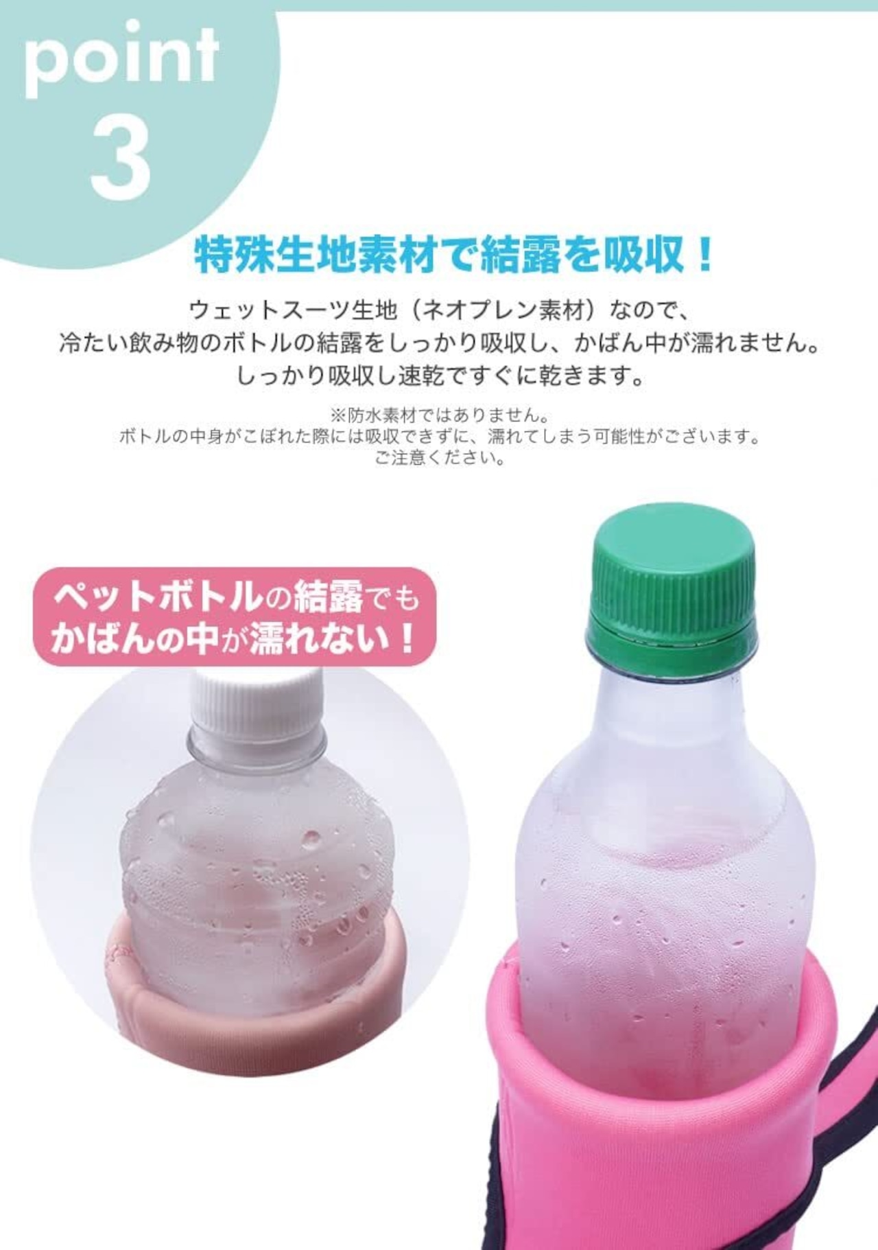 ウェットスーツ生地(ネオプレン素材)なので、冷たい飲み物のボトルの結露をしっかり吸収し、かばん中が濡れません。
