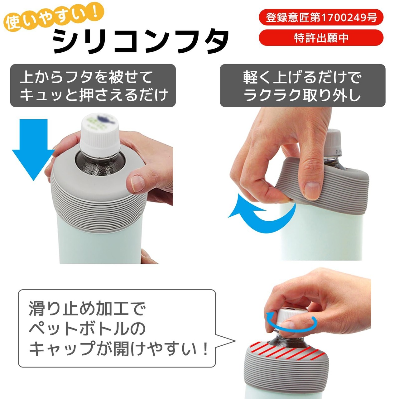 ●滑り止め加工が施されたシリコーン蓋でキャップの開閉時にペットボトル本体が回転しにくくなっています。