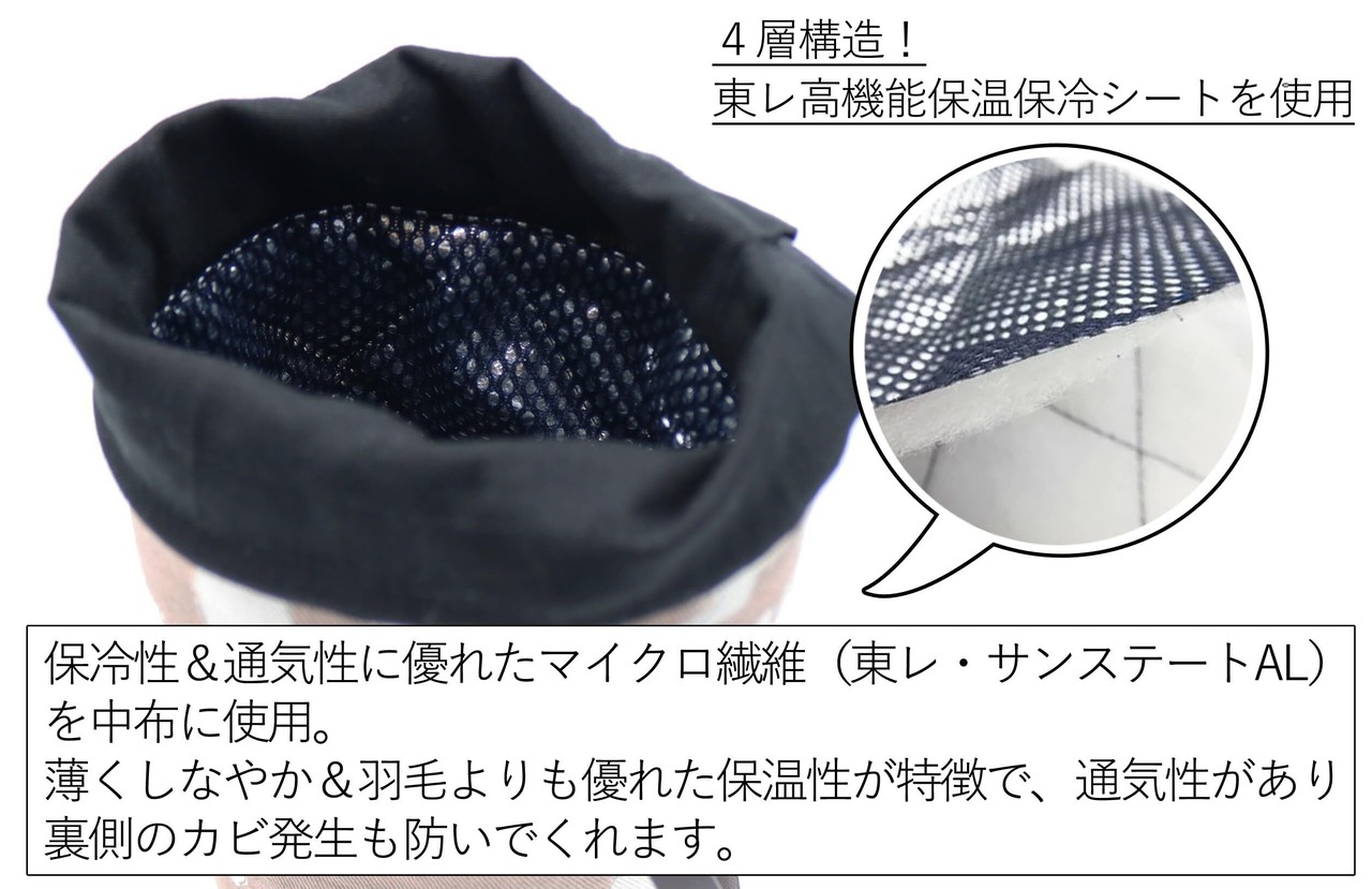 一般的な保冷保温シートとは違い、裏にカビが生えたりはがれてくることがなく布のような柔らかさがあります。冷たいものを入れても結露しにくい素材です。