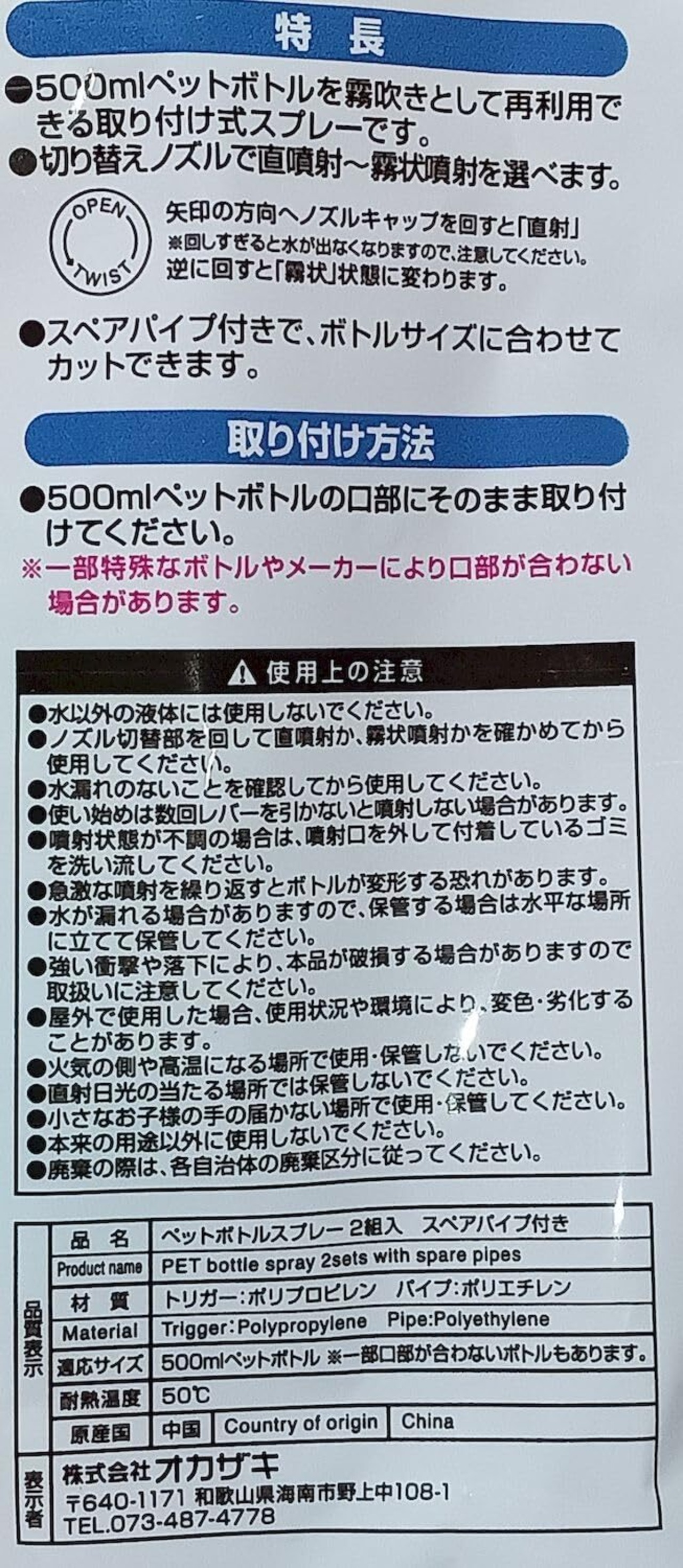 【ペットボトルが霧吹きに! 直噴射 霧状噴射】 ペットボトルスプレー 2個入り パイプをボトルサイズに合わせてカット スペアパイプ付き 園芸 掃除 アイロン掛けなどに 【2個セット】