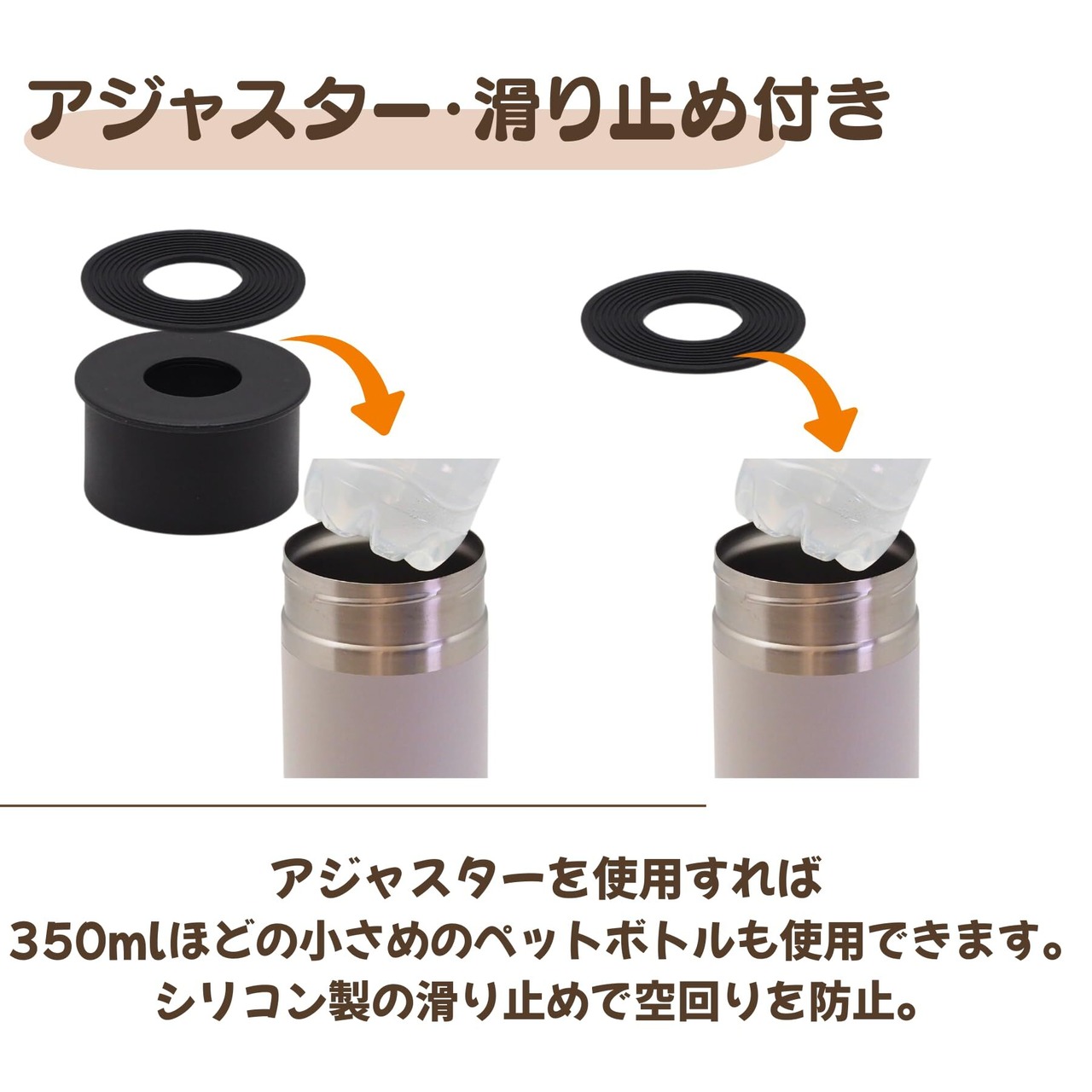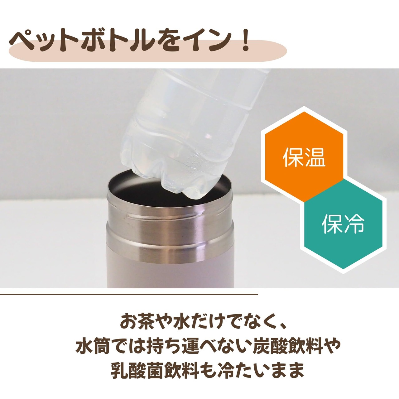 ペットボトルごと入れて、温度を保ったまま持ち運べるステンレスペットボトルホルダー。炭酸飲料や乳飲料も持ち歩けます。