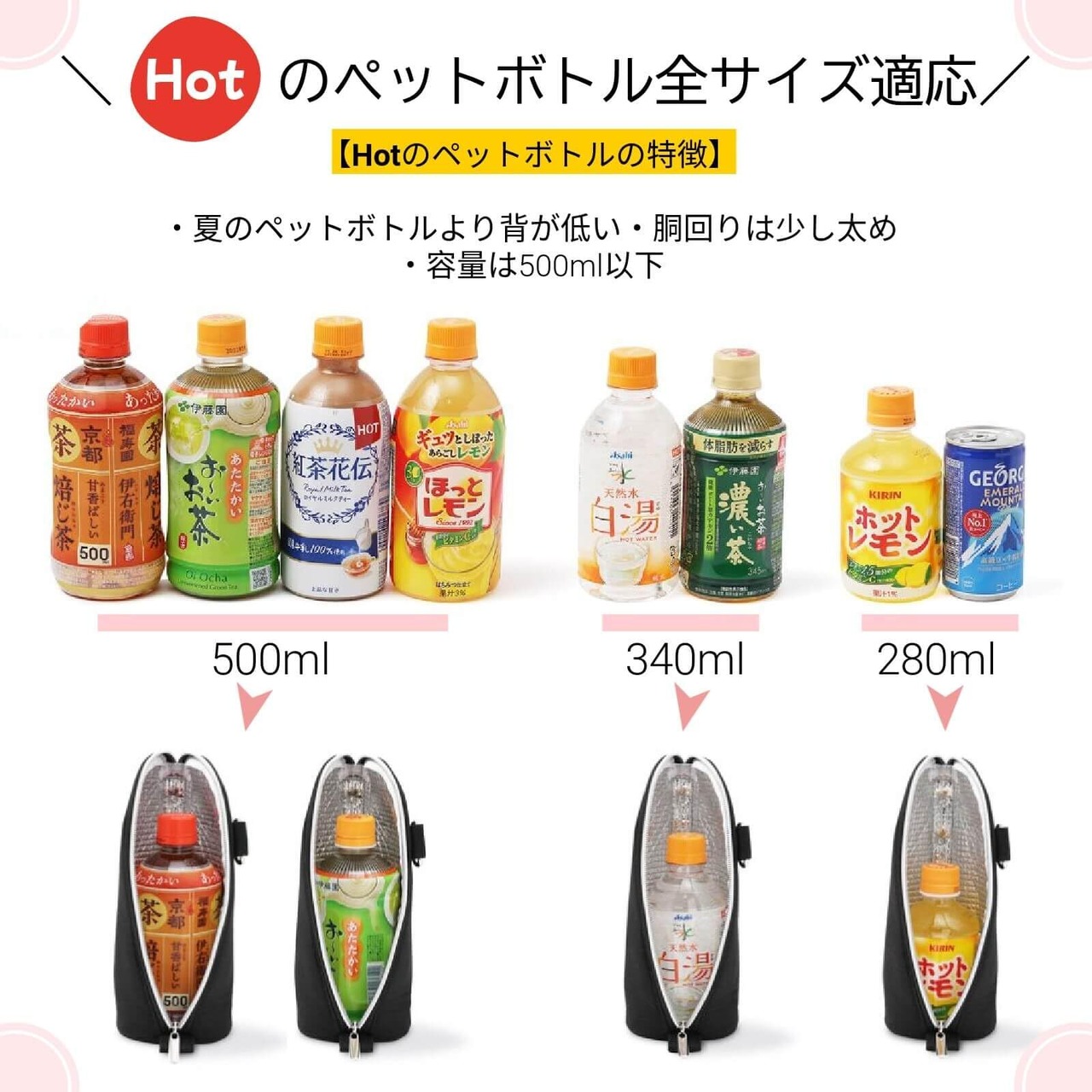 【HOTペットボトルの全サイズに対応】HOTのペットボトルのサイズは一般的なペットボトルに比べて<最大容量が500mlまで><ボトルの高さが低め>という二つの特徴があります。本商品は最大容量の500mlを基準として形状を作り、HOTの全サイズに対応しています。HOT以外ご使用の場合は、水筒なら容量350mlまではOK、一般的でHOTでないペットボトルならスコール500mlの高さ以下のものならOKです。また、薄く畳めるのでいつもの通勤カバンやお出かけバッグに常備すれば外出中に場所や時間を問わずHOTペットボトルのためにすぐ使えます。シーズン的には、最初の温度を長く保つ仕組で保温も保冷も同じく効果が高いため、冬は寒さや冷え対策に保温、夏は熱中症対策に保冷、一年中活躍できます。