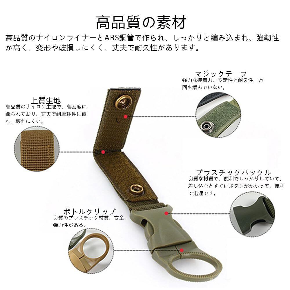 1.【製品仕様】4個セットカラー:ブラック+カーキ+ミリタリーグリーン+レッドサイズ:約14.2×2.5cm。 2.【高品質材質】フックは良質なナイロン及びABSプラスチックテープのバックルを選択して製造し、靭性が高く、編みがしっかりしており、変形破損、傷、色あせしにくい。マジックテープ、バックル、フックの3種類のファスナーは、ペットボトルをしっかり固定し、緩みにくいようにしています。 3.【使いやすい】ワンタッチで簡単にの着脱が可能。またカラビナ付きなので、ベルトやリュックの持ち手などにもかけてしっかり固定されています。 4.【持ち運びに便利】旅先や外出するときに、持ち運び便利なペットボトルホルダーがあるなら、のどが渇くと飲料または飲水が便利。旅行やアウトドアスポーツに最適で、ペットボトルをどこに置くか悩むことなく、自由に楽しめます。ボトルをホルダーに取り付けるだけで、手軽に水分補給ができます。 5.【幅広い用途】犬の散歩、アウトドアスポーツ、キャンプ、ハイキング、釣り、トレッキング、サイクリング、登山旅行などのアウトドアアクティビティに最適です。コンサート、旅行、外出、ショッピング、学園祭、花火大会などでも活躍します。