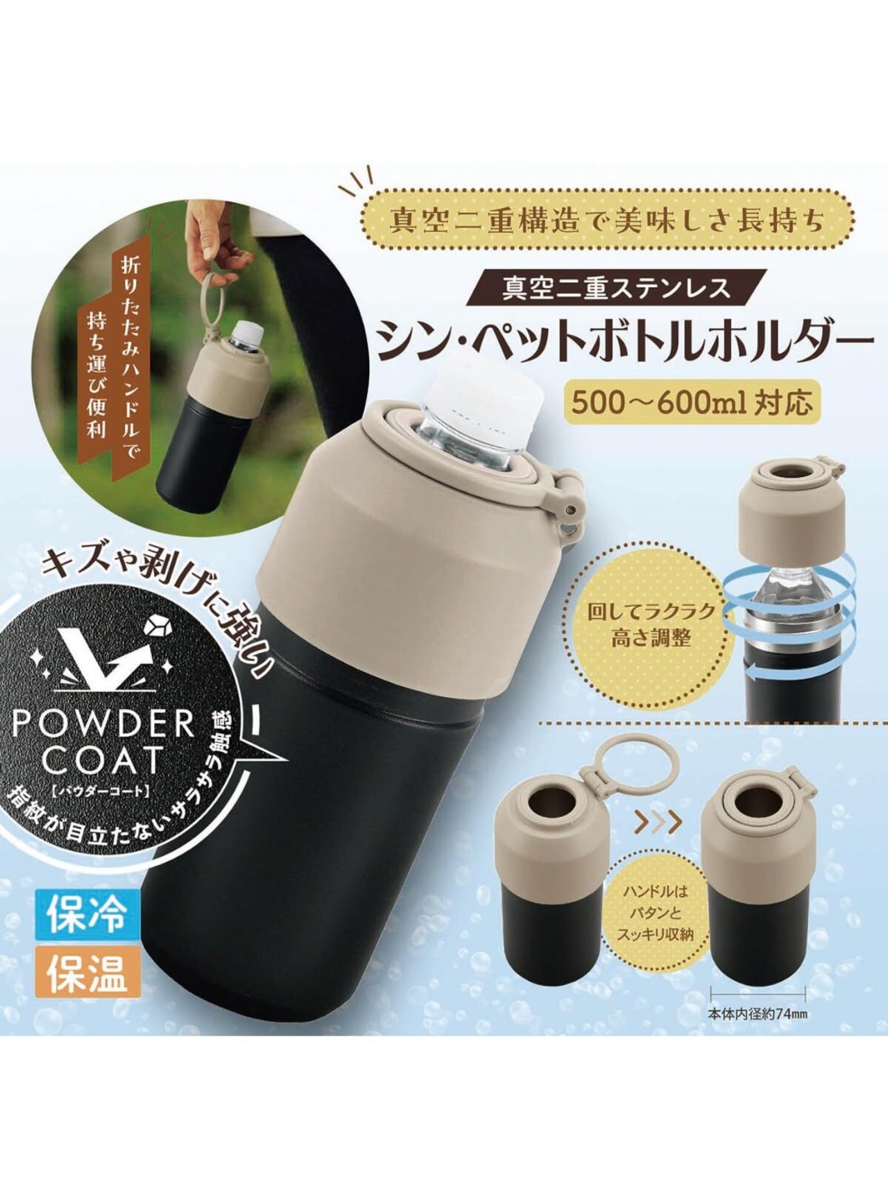 ●ペットボトルホルダーが完全リニューアル! ●500ml~600mlのペットボトルまで幅広く対応可能となりました。 ●保温・保冷効力はそのままに、真空二重構造で美味しさ長持ち。 ●本体にパタンと折りたたんで、スッキリ収納できるハンドル付き。 ●外面はキズや剥げに強いパウダーコートで、アクティブ場面にも◎