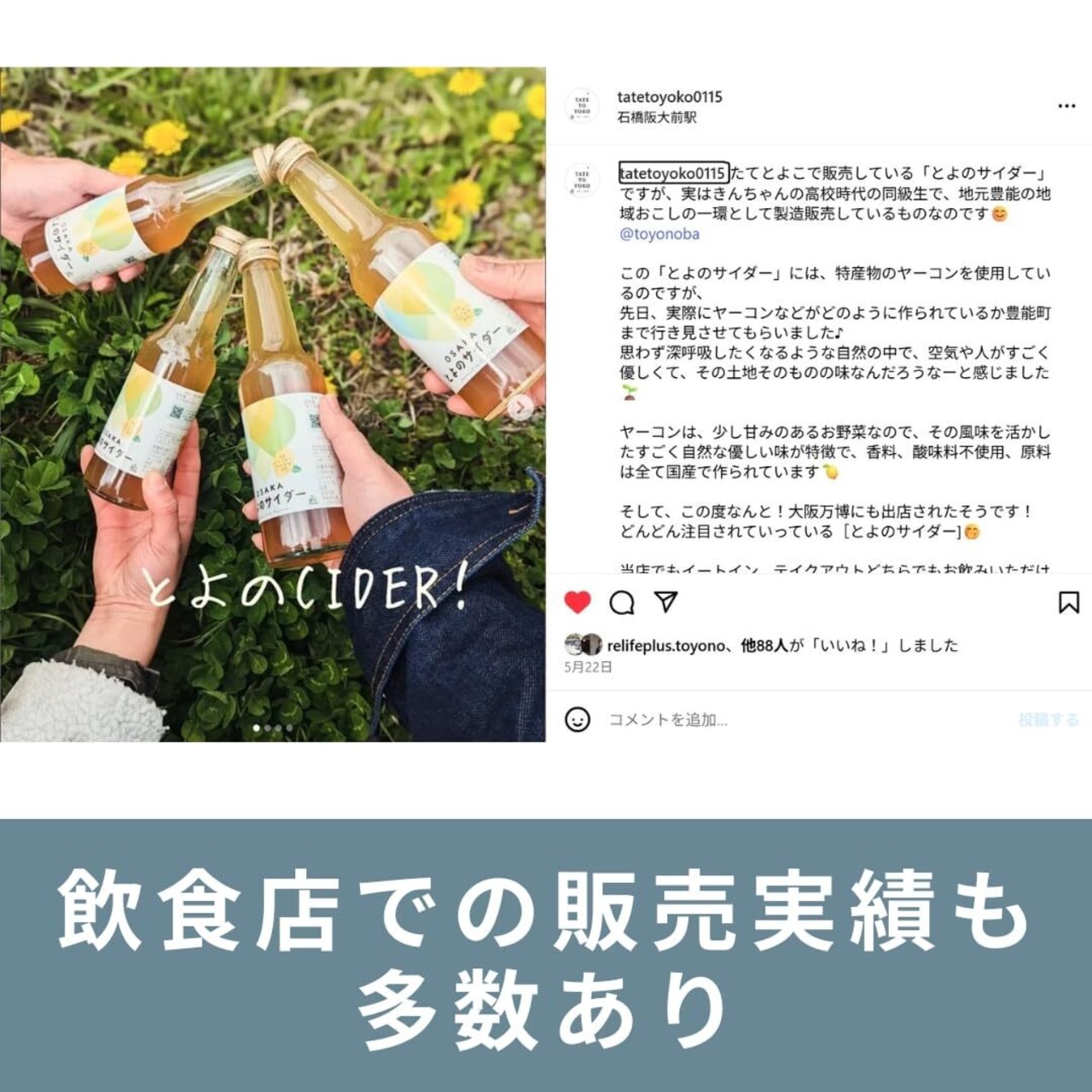 とよのサイダーは、原材料にこだわり国産レモンを贅沢に使用した、爽やかなクラフトサイダーです。甜菜糖由来のまろやかな甘さとキレのある炭酸の刺激が絶妙に調和し、暑い季節にもゴクゴク飲める清涼感あふれる1本に仕上がりました。 健康志向の方にも嬉しい、香料・酸味料・着色料すべて無添加。素材そのものの味わいを大切にしており、お子様からご年配の方まで安心してお楽しみいただけます。 誕生の地・大阪府豊能町から、地域の魅力を詰め込んだ**新しい“地サイダー”**として誕生し、ついにに登場!こだわりの味わいは、ご自宅用にはもちろん、ギフトや手土産としてもご好評をいただいています。 ▼おすすめの楽しみ方: ご家族との団らんや、ピクニック・BBQなどのアウトドアに 仕事の合間やリフレッシュタイムに冷やして1本 アルコールを控えたい時の乾杯ドリンクにも◎ 自然の恵みをそのまま閉じ込めた「とよのサイダー」。毎日の暮らしに、ちょっとした贅沢を。ぜひ一度、お試しください。