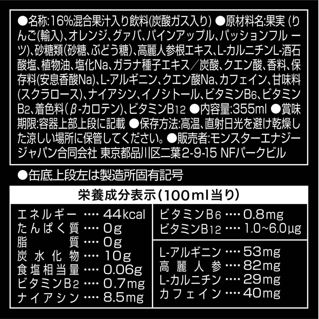 果実(りんご、オレンジ、グァバ、パインアップル、パッションフルーツ)、砂糖類(砂糖、ぶどう糖)、高麗人参根エキス、L-カルニチンL-酒石酸塩、植物油、塩化Na、ガラナ種子エキス/炭酸、クエン酸、香料、保存料(安息香酸Na)、L-アルギニン、クエン酸Na、カフェイン、甘味料(スクラロース)、ナイアシン、イノシトール、ビタミンB6、ビタミンB2、着色料(β-カロテン)、ビタミンB12