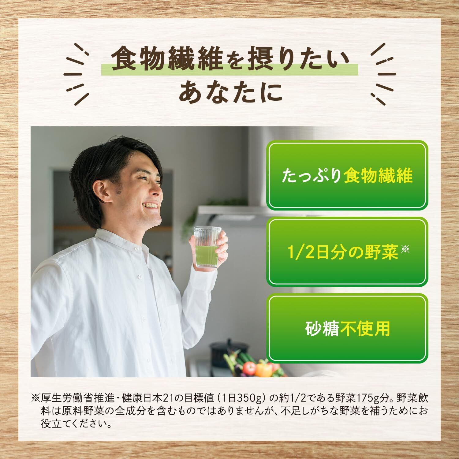原材料:野菜(にんじん(輸入)、ピーマン、メキャベツ(プチヴェール)、小松菜、ケール、ほうれん草、アスパラガス、クレソン、パセリ、かぼちゃ、レタス、キャベツ、ビート、だいこん、はくさい、たまねぎ、セロリ)、果実(りんご、ぶどう、キウイフルーツ、バナナ、レモン)、食物繊維/香料、クエン酸、乳酸カルシウム、ビタミンC、ベニバナ黄色素、クチナシ青色素