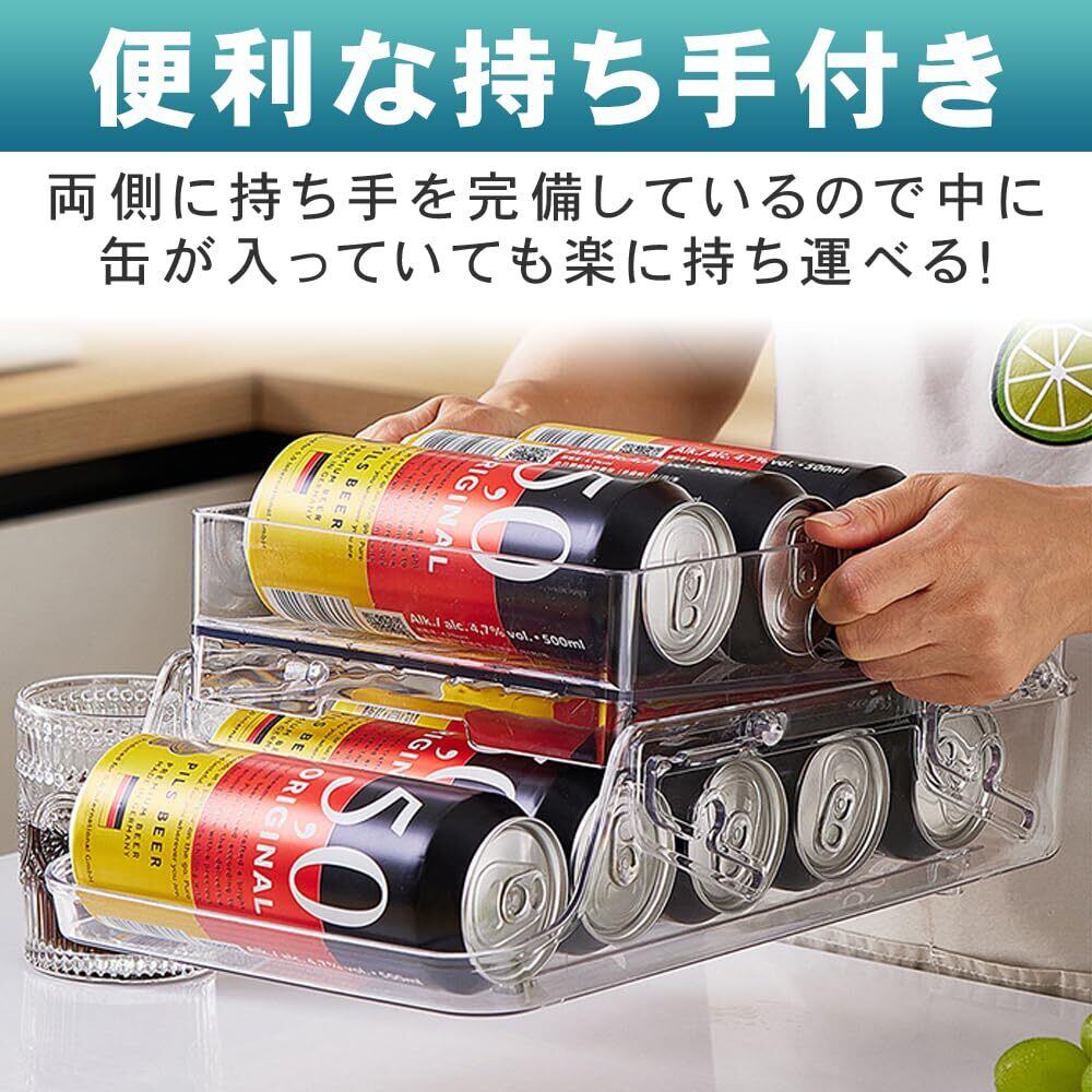 缶ジュースやお酒が冷蔵庫の中で散らからないように整理整頓できる缶ストッカーです。缶を上段から入れて下段から取り出す2段構造により、先に入れて十分に冷えた缶から優先的に取り出せます。