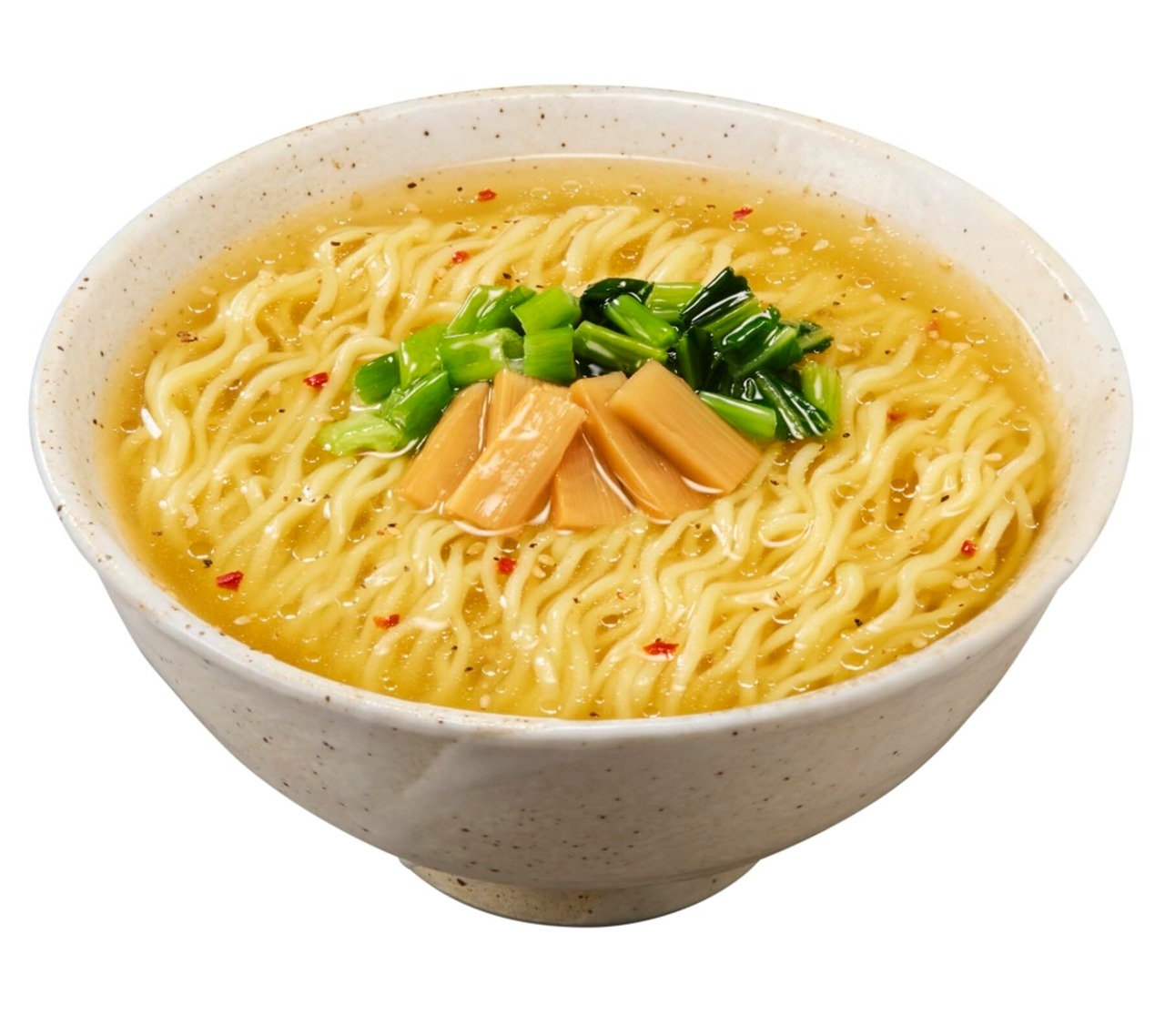 小麦香るノンフライ細麺に、鶏の旨みに玉ねぎの甘みや昆布と鰹のコクを合わせたまろやか塩スープ。