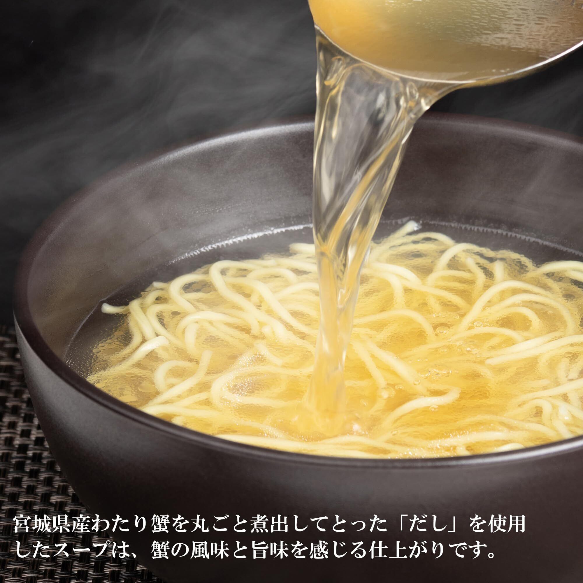 国産素材の「だし」のうまみが効いたラーメン「だし麺」。おいしさはそのままにデザインを替え、生まれ変わりました。宮城県産わたり蟹を丸ごと煮出してとった「だし」を使用したスープは、蟹の風味と旨味を感じる仕上がりです。麺は、生麺を約2日じっくりと時間をかけて熟成と乾燥させたコシのある生麺食感です。【ゆで時間・4分半】