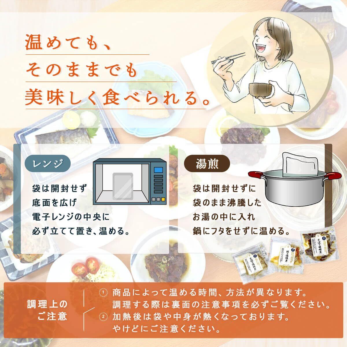 鮭の塩焼き や 鯖の味噌煮 等 温めるだけで 定番 の 美味しい 煮魚 焼き魚 が食べられる 和風 魚 惣菜セット 。 毎日の ご飯 のお供 や お弁当 の おかず 、 忙しい時の 一品 時短 ごはん にも おすすめ 。