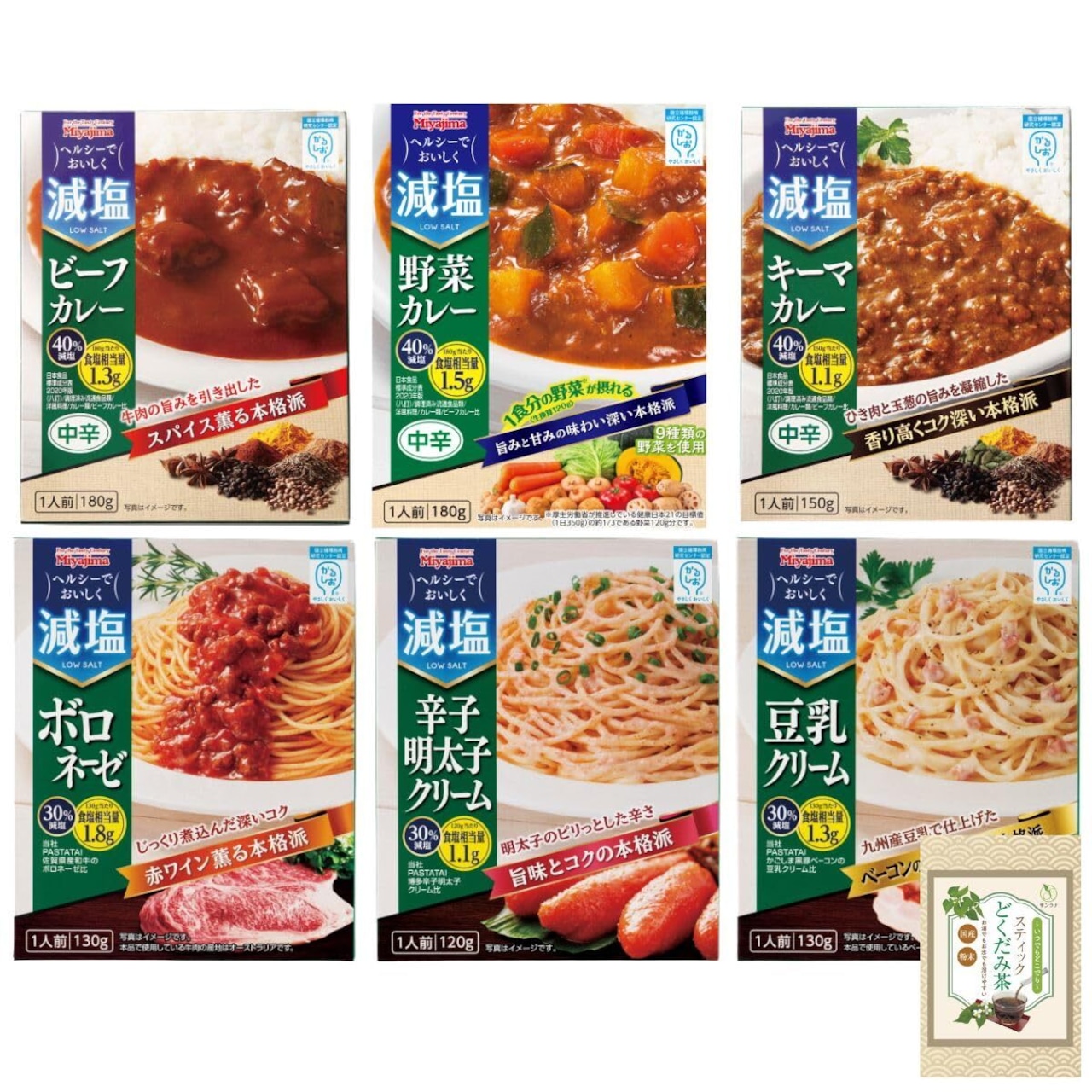 宮島醤油 減塩 レトルト 食べ比べ 詰め合わせ カレー 中辛 (ビーフカレー 野菜カレー キーマカレー) パスタソース (明太子クリーム ボロネーゼ 豆乳クリーム) + スティックどくだみ茶1本 減塩料理 減塩 レトルト食品
