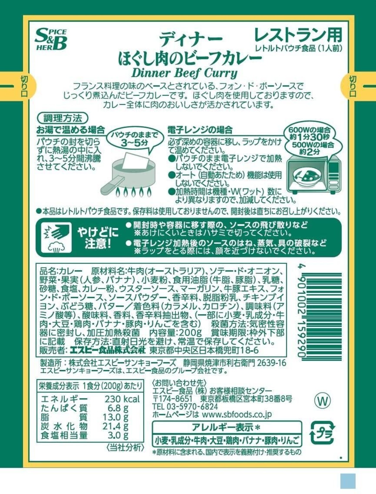 牛肉(オーストラリア)、ソテー・ド・オニオン、野菜・果実(人参、バナナ)、小麦粉、食用油脂(牛脂、豚脂)、乳糖、砂糖、食塩、カレー粉、ウスターソース、マーガリン、牛豚エキス、フォン・ド・ボーソース、ソースパウダー、香辛料、脱脂粉乳、チキンブイヨン、ぶどう糖、バター/着色料(カラメル、カロチン)、調味料(アミノ酸等)、酸味料、香料、香辛料抽出物、(一部に小麦・乳成分・牛肉・大豆・鶏肉・バナナ・豚肉・りんごを含む)