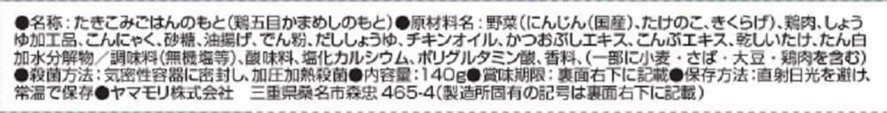 野菜(にんじん(国産)、たけのこ、きくらげ)、鶏肉、しょうゆ加工品、こんにゃく、砂糖、油揚げ、でん粉、だししょうゆ、チキンオイル、かつおぶしエキス、こんぶエキス、乾しいたけ、たん白加水分解物/調味料(無機塩等)、酸味料、塩化カルシウム、ポリグルタミン酸、香料、(一部に小麦・さば・大豆・鶏肉を含む)