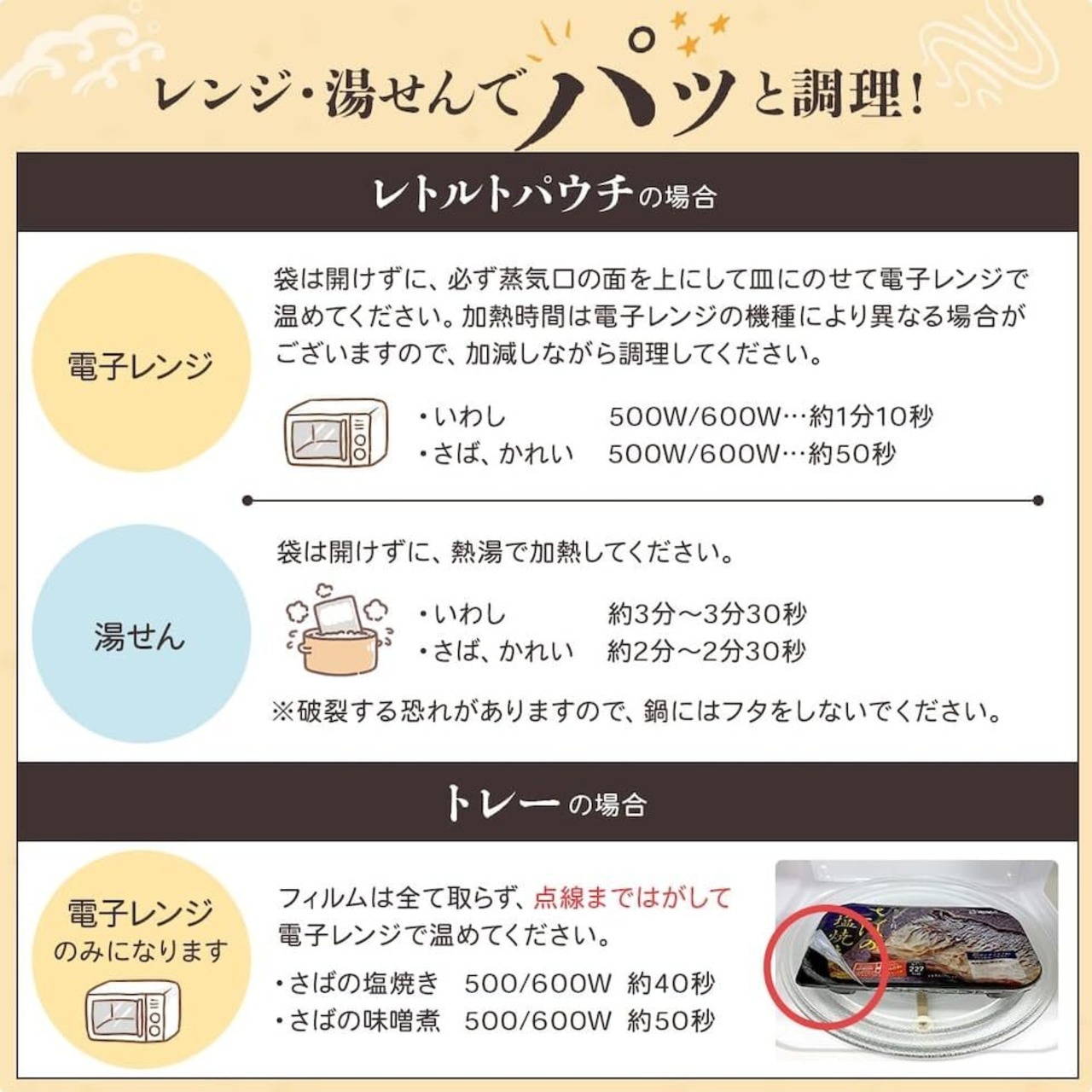 電子レンジ対応 だから パウチ トレイ のまま レンチン で 温めるだけ で 美味しい 魚 料理 が 簡単 手軽 に味わえます。毎日の 食事 の おかず ご飯のお供や 忙しい時の 一品 時短 ごはん に おすすめ です。
